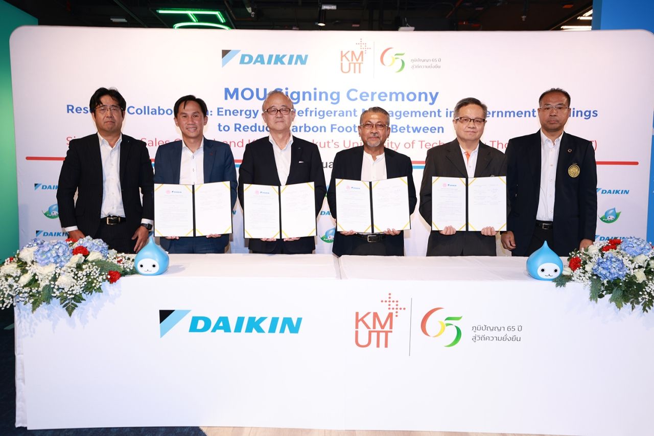 พร้อมวิจัยเทคโนโลยี : บริษัท สยามไดกิ้นเซลส์ จำกัด และมหาวิทยาลัยเทคโนโลยีพระจอมเกล้าธนบุรี (มจธ.) ร่วมลงนามบันทึกข้อตกลงความร่วมมือด้านการวิจัย (MOU) เพื่อขับเคลื่อนการศึกษาวิจัยเรื่อง การจัดการพลังงานและสารทำความเย็นในอาคารภาครัฐเพื่อลดคาร์บอนฟุตพริ้นท์ของอาคาร พร้อมยกระดับเป้าหมายด้านความยั่งยืน (Sustainability) โดยมอบชอากาศที่ดี ร่วมกับพลังงานที่มีประสิทธิภาพผ่านการวิจัยและพัฒนาเทคโนโลยีที่ช่วยปรับปรุง IAQ ควบคู่การออกแบบและควบคุมระบบปรับอากาศให้ใช้พลังงานอย่างคุ้มค่า พร้อมยกระดับแนวทางการควบคุมมลพิษอย่างยั่งยืนในระยะยาว ให้สอดคล้องกับเป้าหมายด้าน Carbon Neutrality และการลดการปล่อยก๊าซเรือนกระจกที่กำลังเป็นวาระร่วมขององค์กรทุกภาคส่วน
