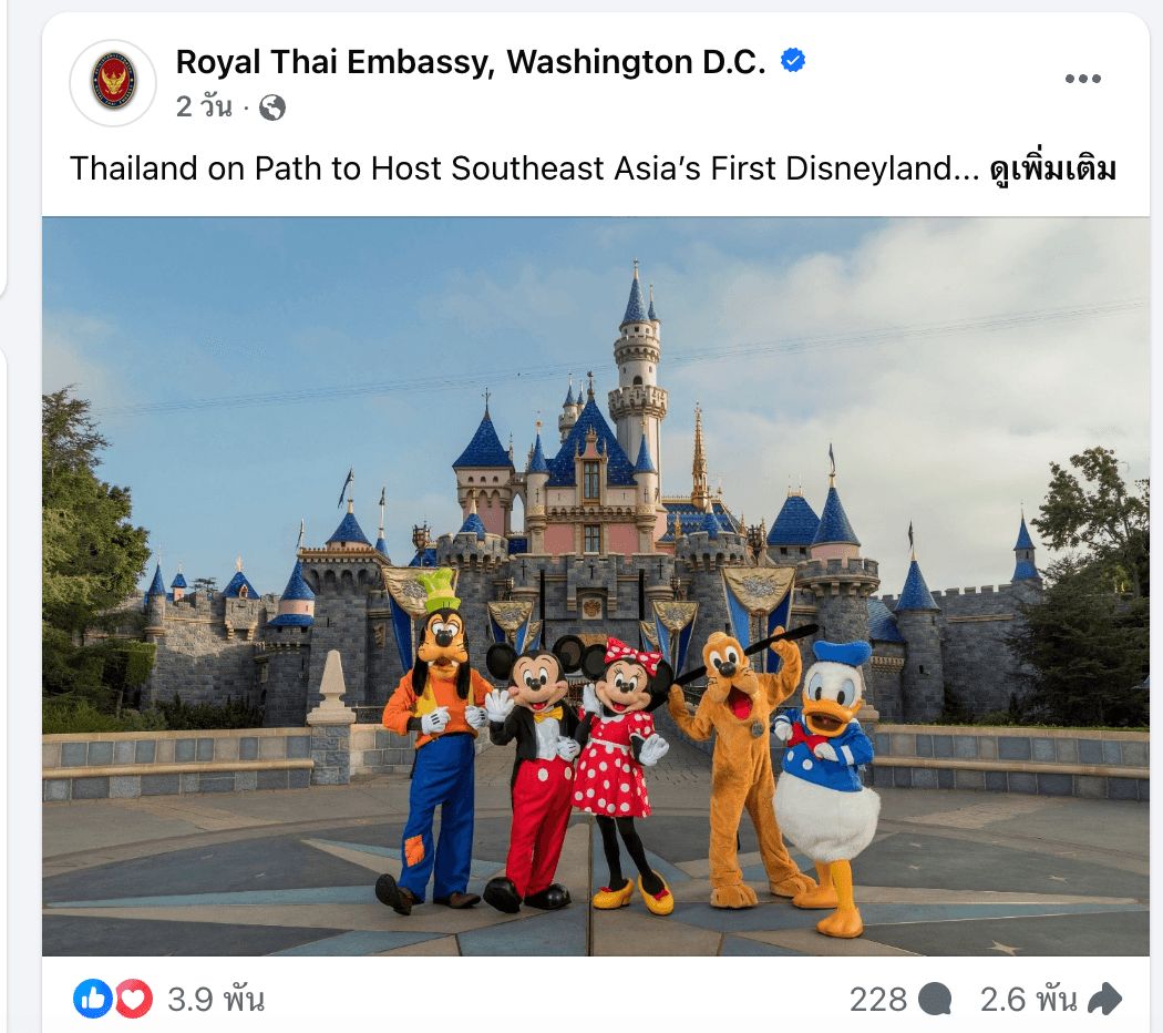 ขณะเดียวกัน ล่าสุดโพสต์ของสถานเอกอัครราชทูตไทย ณ กรุงวอชิงตัน ดี.ซี. ก็สื่อสารไปในทิศทางเดียวกันว่า ไทยกำลังพยายามวางตัวเองเป็นตัวเลือกของ Disneyland แห่งแรกในเอเชียตะวันออกเฉียงใต้ โดยใช้ความพร้อมของพื้นที่ EEC เป็นจุดขายหลัก