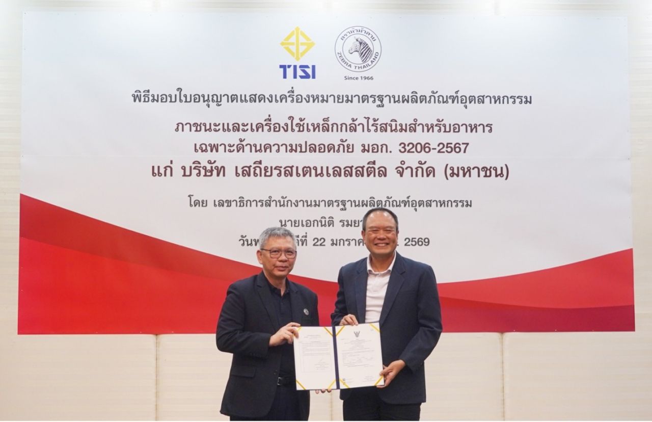 คว้า มอก. ด้านความปลอดภัย : บริษัท เสถียรสเตนเลสสตีล จำกัด (มหาชน) ผู้ประกอบการอุตสาหกรรมเครื่องครัวไทยชั้นนำระดับสากล ภายใต้แบรนด์ตราหัวม้าลาย (ZEBRA Brand) และ ตราพระอาทิตย์ (Sun’z Brand) โดย ดร.เอกชัย ยังวาณิช ประธานกรรมการบริหารและกรรมการผู้จัดการ เข้ารับมอบใบอนุญาตแสดงเครื่องหมายมาตรฐานผลิตภัณฑ์อุตสาหกรรม ภาชนะและเครื่องใช้เหล็กกล้าไร้สนิมสำหรับอาหาร เฉพาะด้านความปลอดภัย มอก. 3206-2567 สำหรับผลิตภัณฑ์ประเภท หม้อ กระทะ ถาดหลุมใส่อาหาร ปิ่นโต ตะหลิว ช้อน และส้อมของบริษัทฯ ซึ่งถือเป็นบริษัทเดียวในประเทศไทยที่ได้รับการรับรองดังกล่าวในปัจจุบัน เพื่อใช้เป็นหลักฐานยืนยันความปลอดภัยแก่ผู้บริโภค