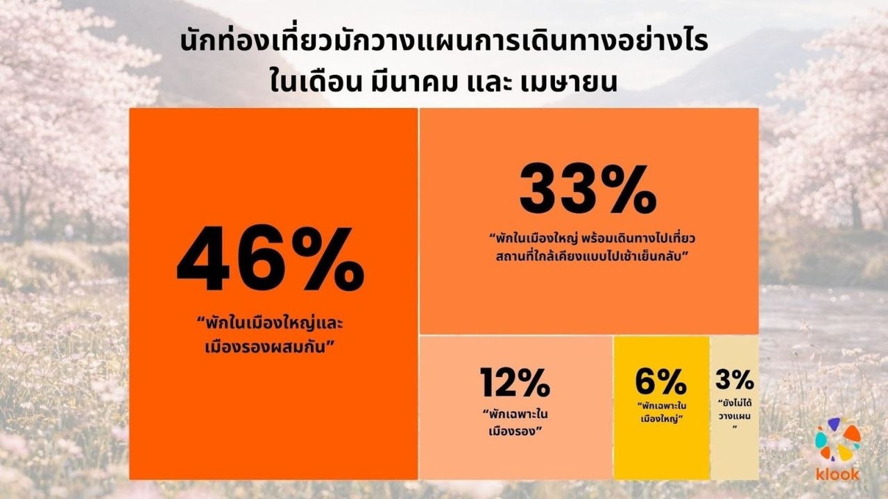 ผู้สื่อข่าวรายงานว่า ดัชนี Sakura Readiness Index ซึ่งพัฒนาต่อยอดจากงานวิจัย Travel Pulse ของ Klook แพลตฟอร์มท่องเที่ยวออนไลน์ ที่ติดตามพฤติกรรมการเดินทางช่วงไฮซีซั่นในเอเชียแบบเรียลไทม์ พบว่า ญี่ปุ่นยังคงเป็นจุดหมายปลายทางอันดับหนึ่งในฤดูใบไม้ผลิ คิดเป็น 78% รองลงมาเป็นเกาหลีใต้ 52% และจีนแผ่นดินใหญ่ 42% โดยแรงจูงใจหลักยังอยู่ที่การท่องเที่ยวตามฤดูกาล โดยเฉพาะการชมซากุระ
