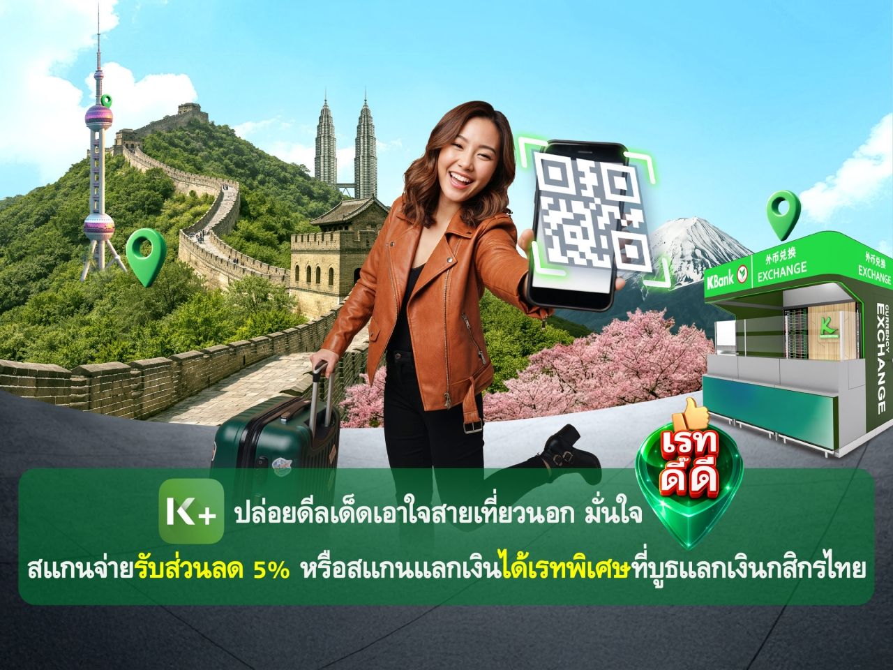 เอาใจสายเที่ยว : K PLUS ปล่อยโปรโมชันเด็ดเอาใจสายเที่ยวนอกรับช่วงเทศกาลหยุดยาว ใช้จ่ายต่างประเทศมั่นใจได้เรทดี๊ดี ทั้งการสแกนจ่าย QR ผ่าน K+ Go Inter รับส่วนลดสูงสุด 5% ทุกร้านที่มีสัญลักษณ์ Alipay+ ในประเทศจีน ญี่ปุ่น สิงคโปร์ และมาเลเซีย หรือสแกนแลกเงินสดผ่าน K PLUS รับอัตราแลกเปลี่ยนพิเศษทันทีที่บูธแลกเงินธนาคารกสิกรไทยทั่วประเทศ ทั้งในและนอกสนามบิน เพียงมี K PLUS ก็สามารถรับส่วนลดและสิทธิพิเศษได้ทันที ไม่ต้องลงทะเบียน