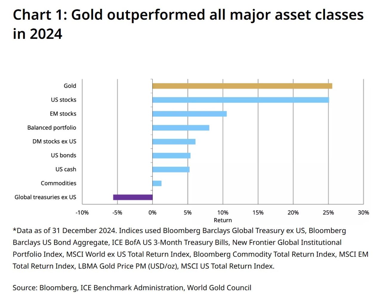 สำหรับในปี 2567 ที่ผ่านมา ทองคำมีผลการดำเนินงานที่ยอดเยี่ยม โดยปรับตัวเพิ่มขึ้นถึง 25.5% แซงหน้าสินทรัพย์หลักทุกประเภท ซึ่งเป็นอัตราการเติบโตรายปีสูงที่สุดในรอบ 24 ปี เนื่องจากนักลงทุนใช้ทองคำในการป้องกันความเสี่ยงจากความไม่แน่นอนทางภูมิรัฐศาสตร์และความผันผวนของตลาดที่เพิ่มขึ้นในปีที่ผ่านมา โดยตลอดทั้งปีราคาทองคำจากสมาคมตลาดทองคำแห่งลอนดอนที่ทำการซื้อขายช่วงบ่าย (LBMA Gold Price PM) ได้ทำสถิติแตะระดับสูงสุดใหม่ถึง 40 ครั้ง โดยราคาสูงสุดตลอดกาล (All-Time High) ของทองคำครั้งล่าสุดนั้นอยู่ที่ 2,777.80 ดอลลาร์สหรัฐต่อออนซ์ เมื่อวันที่ 30 ตุลาคม 2567 ที่ผ่านมา