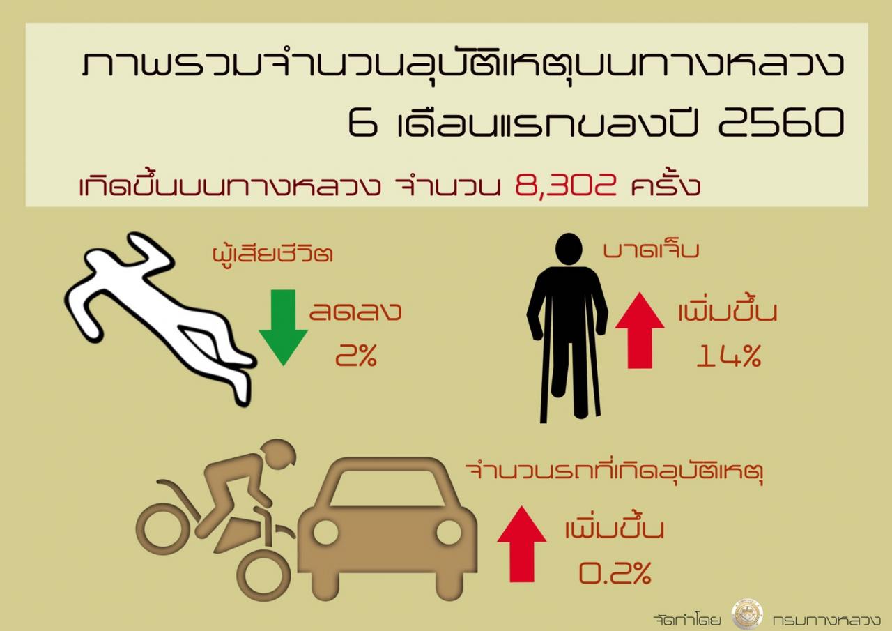 วันที่ 15 ส.ค. 60 นายธานินทร์ สมบูรณ์ อธิบดีกรมทางหลวง เปิดเผยว่า กรมทางหลวง โดยสำนักอำนวยความปลอดภัย ได้สรุปรายงานข้อมูลอุบัติเหตุบนทางหลวงทั่วประเทศ ประจำงวดครึ่งปี 1 ม.ค. – 30 เม.ย. 60 จากการรายงานอุบัติเหตุทางระบบ HAIMS พบว่า ได้มีอุบัติเหตุเกิดขึ้นบนทางหลวงในความรับผิดชอบของกรมทางหลวง จำนวน 8,302 ครั้ง ทำให้มีผู้เสียชีวิต 1,350 คน ได้รับบาดเจ็บทั้งสิ้น 9,682 คน จำนวนรถที่เกิดอุบัติเหตุ 12,551 คัน เป็นเหตุให้ทรัพย์สินของกรมทางหลวงเสียหายประมาณ 278 ล้านบาท