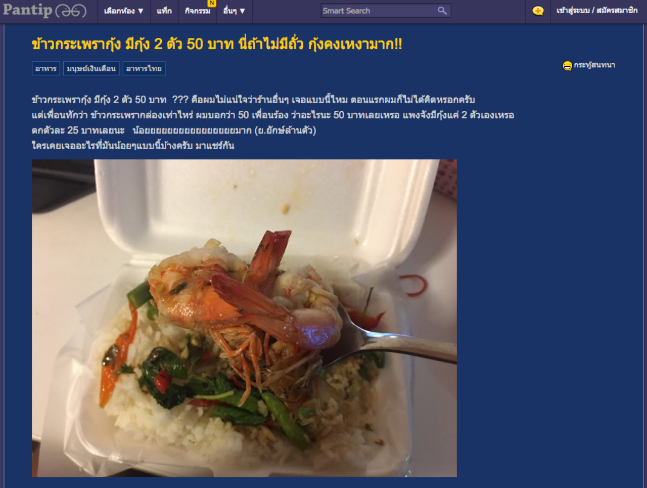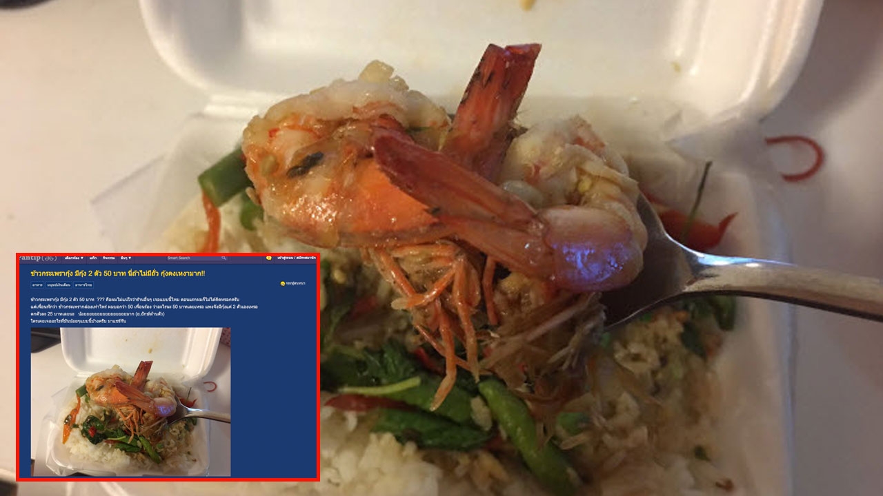 จากกรณีดราม่าร้อนๆ ในเว็บบอร์ดชื่อดังอย่างพันทิป เมื่อมีคนมาตั้งกระทู้ว่า ‘ข้าวกะเพรากุ้ง มีกุ้ง 2 ตัว 50 บาท นี่ถ้าไม่มีถั่ว กุ้งคงเหงามาก!!’ พร้อมโพสต์ภาพสุดช้ำใจเมื่อสั่งข้าวกะเพรากุ้งแถวห้วยขวางในราคา 50 บาท แต่กลับได้กุ้งเพียง 2 ตัว โดยบางความคิดเห็นมองว่า วัตถุดิบอย่างกุ้งมีราคาค่อนข้างแพง ขณะที่ บางคอมเมนต์มองว่า ให้น้อยเกินไปเมื่อเทียบกับราคา 50 บาท