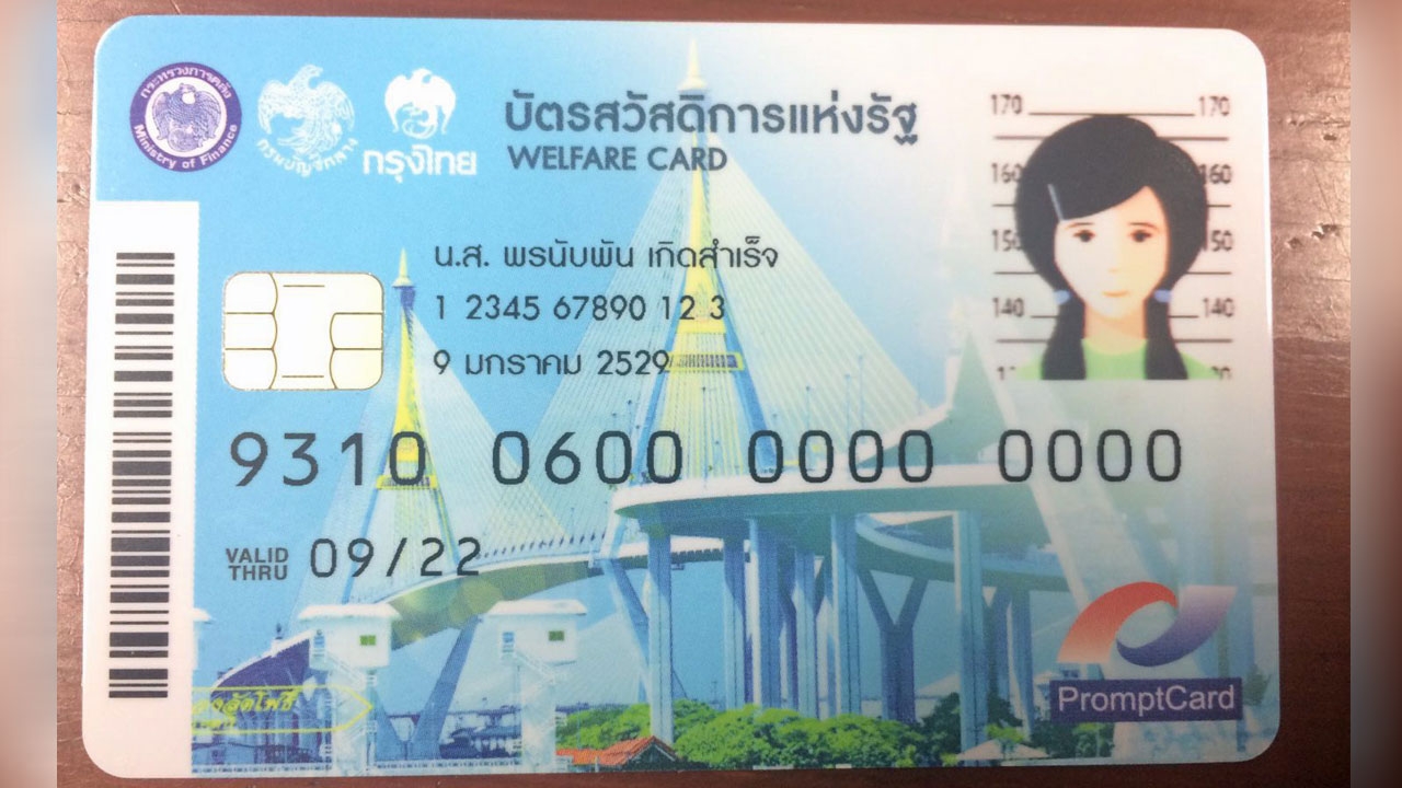 ภาพบัตรสวัสดิการแห่งรัฐที่ ครม.มีมติอนุมัติโครงการประชารัฐสวัสดิการ ที่จะเตรียมแจกประชาชนผู้มีรายได้น้อยที่ลงทะเบียนกับรัฐกว่า 11 ล้านคน เริ่มใช้ 1 ตุลาคม นำไปเป็นส่วนลดค่าใช้จ่ายในครัวเรือนและขึ้นรถเมล์ รถไฟฟ้าโดยรัฐยอมควักเงินก้อนโตกว่า 4 หมื่นล้านบาทช่วยเหลือ.