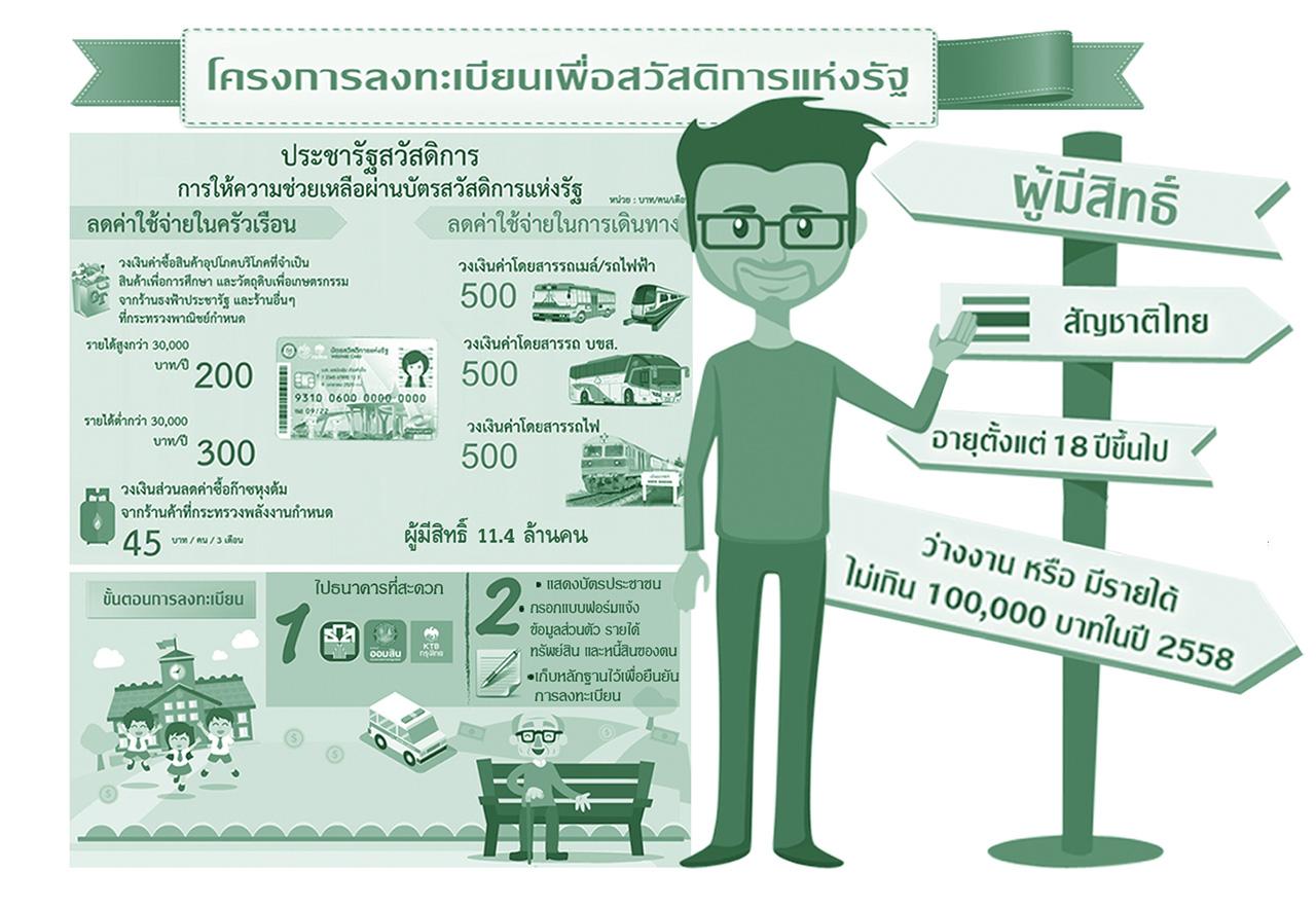 เริ่มต้นจากบัตรสวัสดิการแห่งรัฐ ที่เปิดให้ประชาชนผู้มีรายได้น้อยปีละ 30,000–100,000 บาท และต่ำกว่าเส้นยากจนที่มีกระทรวงการคลัง โดยกรมบัญชีกลาง, ธนาคารรัฐ, กระทรวงพาณิชย์ และจังหวัดต่างๆร่วมมือกันในการให้ความช่วยเหลือเบื้องต้นแก่ประชาชนในการลดค่าใช้จ่ายภาคครัวเรือน และค่าใช้จ่ายในการเดินทางลง
