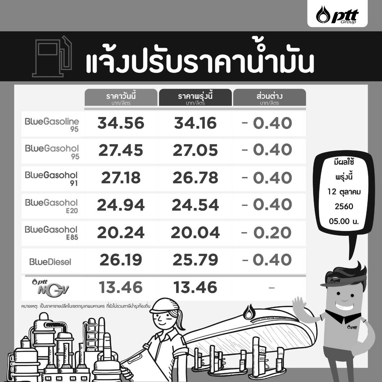 วันที่ 11 ต.ค.60 บมจ.ปตท. และ บมจ.บางจากปิโตรเลียม ประกาศปรับลดราคาขายปลีกน้ำมันทุกชนิด 40 สตางค์/ลิตร ยกเว้น E85 ลดลง 20 สตางค์/ลิตร มีผลเวลา 05.00 น. วันที่ 12 ต.ค.60