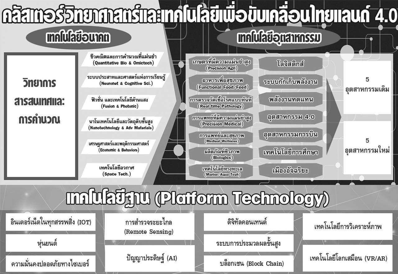 และเทคโนโลยีที่เป็นแพลตฟอร์ม (Platform Technology) เช่น ปัญญาประดิษฐ์ หุ่นยนต์ อินเตอร์เน็ตในทุกสรรพสิ่ง หรือ Internet of Things (IoT) และดิจิทัล เป็นต้น