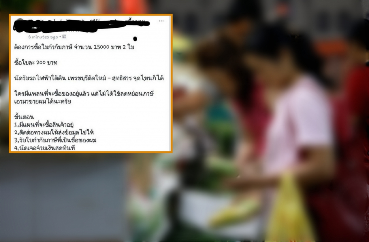 ผู้สื่อข่าวรายงานว่า ก่อนหน้าได้มีเฟซบุ๊กเกี่ยวกับภาษีโพสต์แจ้งว่า ได้พบเฟซบุ๊กชื่อหนึ่ง ออกประกาศต้องการซื้อใบกำกับภาษี จำนวน 15,000 บาท 2 ใบ ซื้อใบละ 200 บาท สำหรับคนที่มีแผนจะซื้อของอยู่แล้ว แต่ไม่ได้มีแผนใช้ลดหย่อนภาษี เอามาขายตนได้ พร้อมกำหนดสถานที่นัดรับใบกำกับภาษี ตามเส้นทางรถไฟฟ้าใต้ดิน เพชรบุรีตัดใหม่-สุทธิสาร ให้ติดต่อมาเพื่อที่จะส่งข้อมูลไปให้ จากนั้นให้ไปขอใบกำกับภาษีที่เป็นชื่อของตน และนัดเจอเพื่อจ่ายเงินสดให้ทันที.