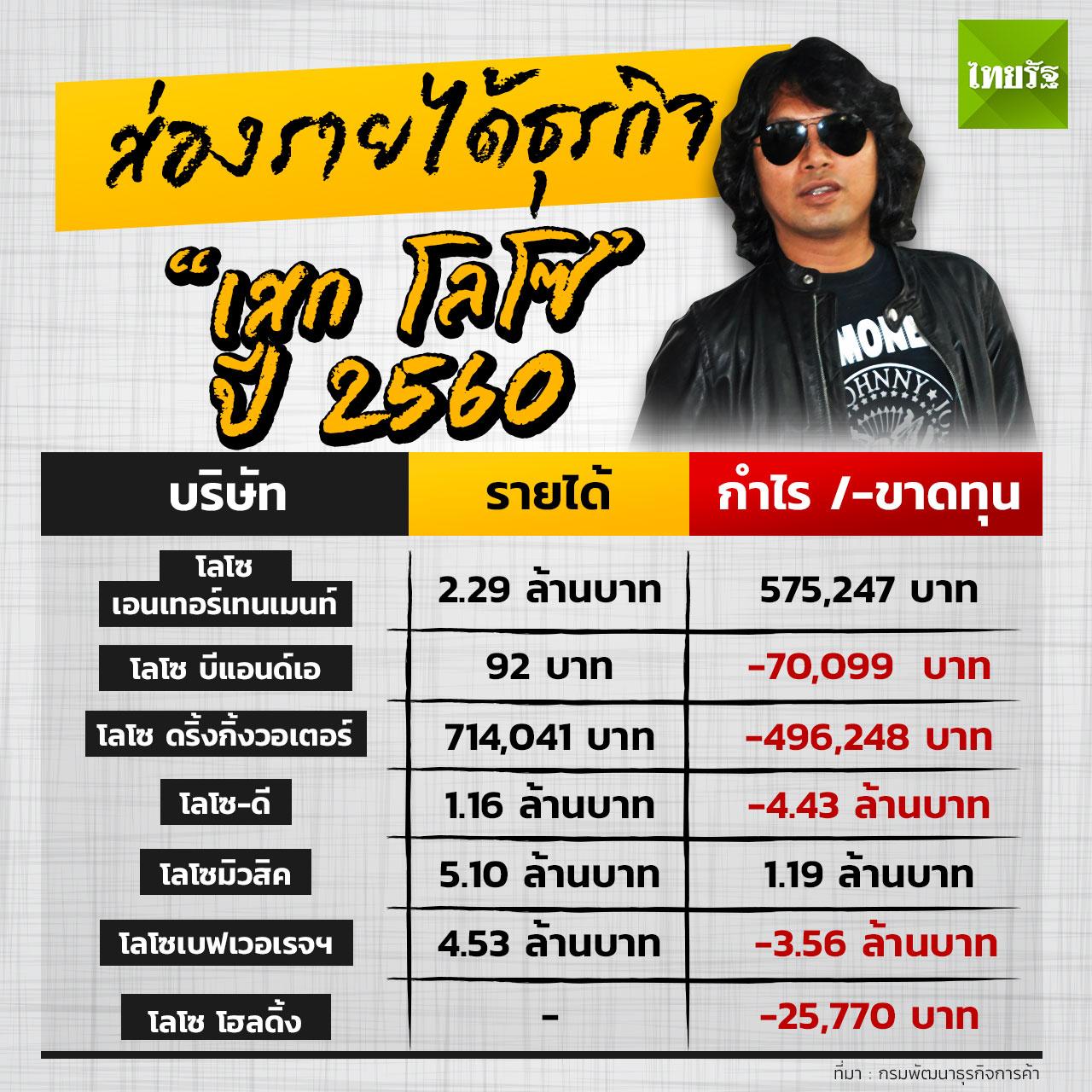 สำรวจความมั่งคั่งปีล่าสุดของร็อกเกอร์ “เสก โลโซ” ในธุรกิจ 7 บริษัท รายได้รวมกว่า 10 ล้านบาท ช่วง 5 ปีกำไร-ขาดทุนสุดสวิง เฟื่องฟูสุดต้องปี 57 บริษัทเดียวรายได้ทะลุ 18 ล้านบาท