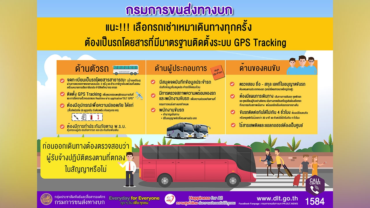 กรมการขนส่งทางบก แนะ!!! เลือกรถโดยสารเช่าเหมาเดินทางทำบุญทอดกฐินอย่างปลอดภัย ต้องเป็นรถที่มีมาตรฐานติดตั้งระบบ GPS Tracking เตือน!!! ควรตรวจสอบประวัติรถและคนขับ ทุกครั้งก่อนการว่าจ้าง วางแผนการเดินทางอย่างเหมาะสม และใช้ความเร็วตามที่กฎหมายกำหนด