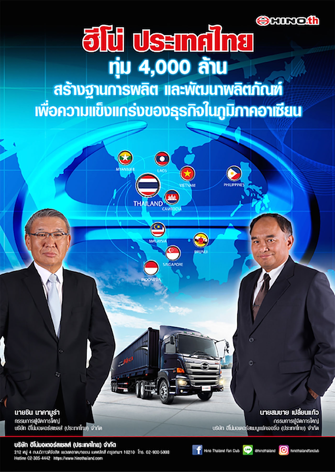 บริษัทฮีโน่มอเตอร์ส จำกัด ประเทศญี่ปุ่น, บริษัทฮีโน่มอเตอร์สแมนูแฟคเจอริ่ง (ประเทศไทย) จำกัด และบริษัทฮีโน่มอเตอร์สเซลส์ (ประเทศไทย) จำกัด ประกาศก่อตั้งฐานการผลิตและพัฒนาผลิตภัณฑ์ในประเทศไทย เพื่อใช้เป็นฐานในการเสริมสร้างความแข็งแกร่งของธุรกิจในภูมิภาคอาเซียน โดยตอบสนองความต้องการของลูกค้าได้อย่างถูกต้อง รวดเร็ว และขยายการบริการแบบบูรณาการเพื่อรองรับการเติบโตทางธุรกิจของลูกค้า