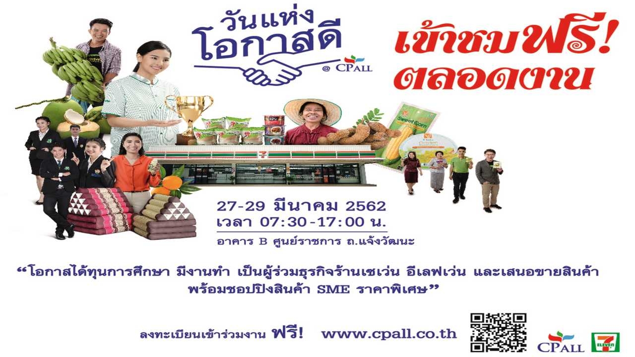 นายสุวิทย์ กิ่งแก้ว รองกรรมการผู้จัดการอาวุโส บริษัท ซีพี ออลล์ จำกัด (มหาชน) ผู้ก่อตั้งร้านเซเว่น อีเลฟเว่น กล่าวว่า ซีพีออลล์ เตรียมจัดงาน "วันแห่งโอกาสดี @ CP ALL" ระหว่างวันที่ 27-29 มี.ค.2562 บริเวณชั้น 2 อาคารรัฐประศาสนภักดี อาคาร B ศูนย์ราชการ ถ.แจ้งวัฒนะ กรุงเทพฯ โดยจะมีการเปิดรับสมัครงานของซีพีออลล์ และบริษัทในกลุ่มธุรกิจตำแหน่งต่างๆ กว่า 35,000 อัตรา ตั้งแต่วุฒิการศึกษาระดับม.6 จนถึงระดับปริญญาเอก ถือเป็นโอกาสครั้งสำคัญ สำหรับผู้สนใจที่จะได้มีโอกาสร่วมงานกับกลุ่มธุรกิจซีพี ออลล์ ผู้สนใจสามารถสมัครงานโดยไม่มีค่าใช้จ่าย ตลอดทั้ง 3 วัน ตั้งแต่เวลา 09.00-17.00 น.