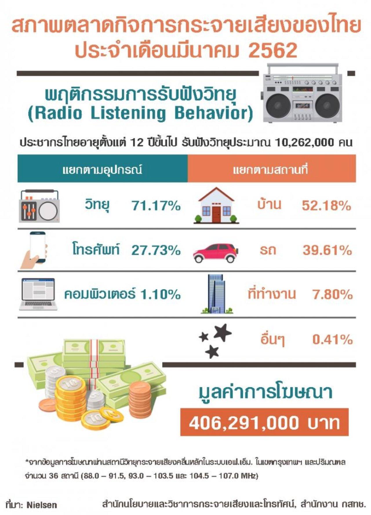 เมื่อวันที่ 23 เม.ย.2562 นายฐากร ตัณฑสิทธิ์ เลขาธิการคณะกรรมการกิจการกระจายเสียง กิจการโทรทัศน์ และกิจการโทรคมนาคมแห่งชาติ (กสทช.) เปิดเผยว่า สำนักงาน กสทช. รายงานสภาพตลาดกิจการโทรทัศน์ภาคพื้นดินในระบบดิจิตอล เดือน มี.ค. 2562 พบว่า ช่องรายการที่ได้รับความนิยมสูงสุด (เรตติ้ง) 10 อันดับแรก ได้แก่ อันดับ 1 ช่อง 7HD เรตติ้ง 1.943 อันดับ 2 ช่อง 3HD เรตติ้ง 1.321 อันดับ 3 ข่อง MONO29 เรตติ้ง 0.795 อันดับ 4 ช่อง Workpoint TV เรตติ้ง 0.710 อันดับ 5 ช่อง ONE HD เรตติ้ง 0.582 อันดับ 6 ช่อง ไทยรัฐ ทีวี เรตติ้ง 0.449 อันดับ 7 ช่อง 3SD เรตติ้ง 0.327 อันดับ 8 ช่อง 8 เรตติ้ง 0.316 อันดับ 9 ช่อง Amarin TV HD เรตติ้ง 0.297 และอันดับ 10 ช่อง Nation TV เรตติ้ง 0.200
