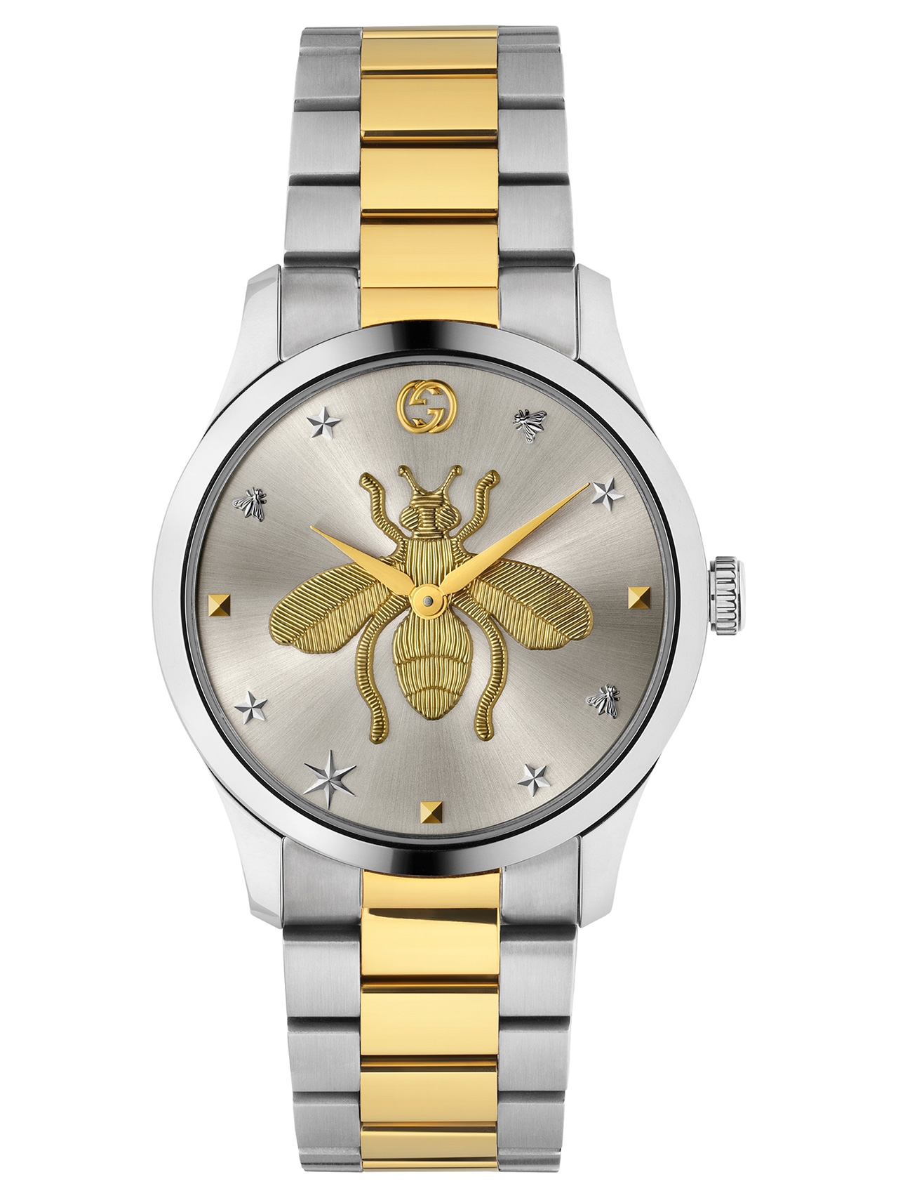 คอลเลกชั่น G-Timeless Iconic ระบบควอตซ์ ตัวเรือนสตีลขนาด 38 มิลลิเมตร ดีไซน์ทรงกลมร่วมสมัย โดดเด่นในรายละเอียดที่ล้วนบอกเล่าความครีเอทีฟ สะท้อนถึงอิสระแห่งจินตนาการด้วยแฟชั่นไอคอนรูปผึ้งขนาดใหญ่ ที่ประดับบนพื้นหน้าปัดเงินซันบรัช ตกแต่งอย่างงดงามด้วยเอฟเฟ็กซ์เสมือนลวดลายปักที่เป็นจิตวิญญาณอันเป็นเอกลักษณ์ของแบรนด์ ประดับด้วยหลากหลายโมทีฟ ทั้ง รูปดาว รูปผึ้ง หมุดสตั๊ด และ Interlocking G ที่นำมารังสรรค์เป็นอินเด็กซ์บอกเวลา ต่างสไตล์ด้วยสายที่มีให้เลือก 2 แบบ คือ สายสแตนเลสสตีล หรือ สายสตีลและเยลโล่ว์โกลด์พีวีดีแบบทูโทน ที่จะมาเพิ่มความหลากหลาย มิกซ์แอนด์แมตช์ได้ง่ายกับทุกโอกาสและทุกสไตล์ที่เป็นคุณ