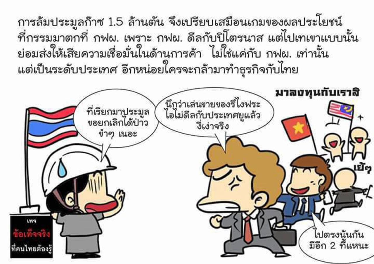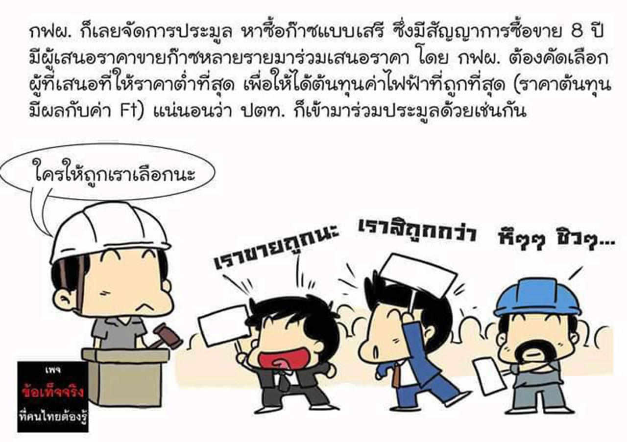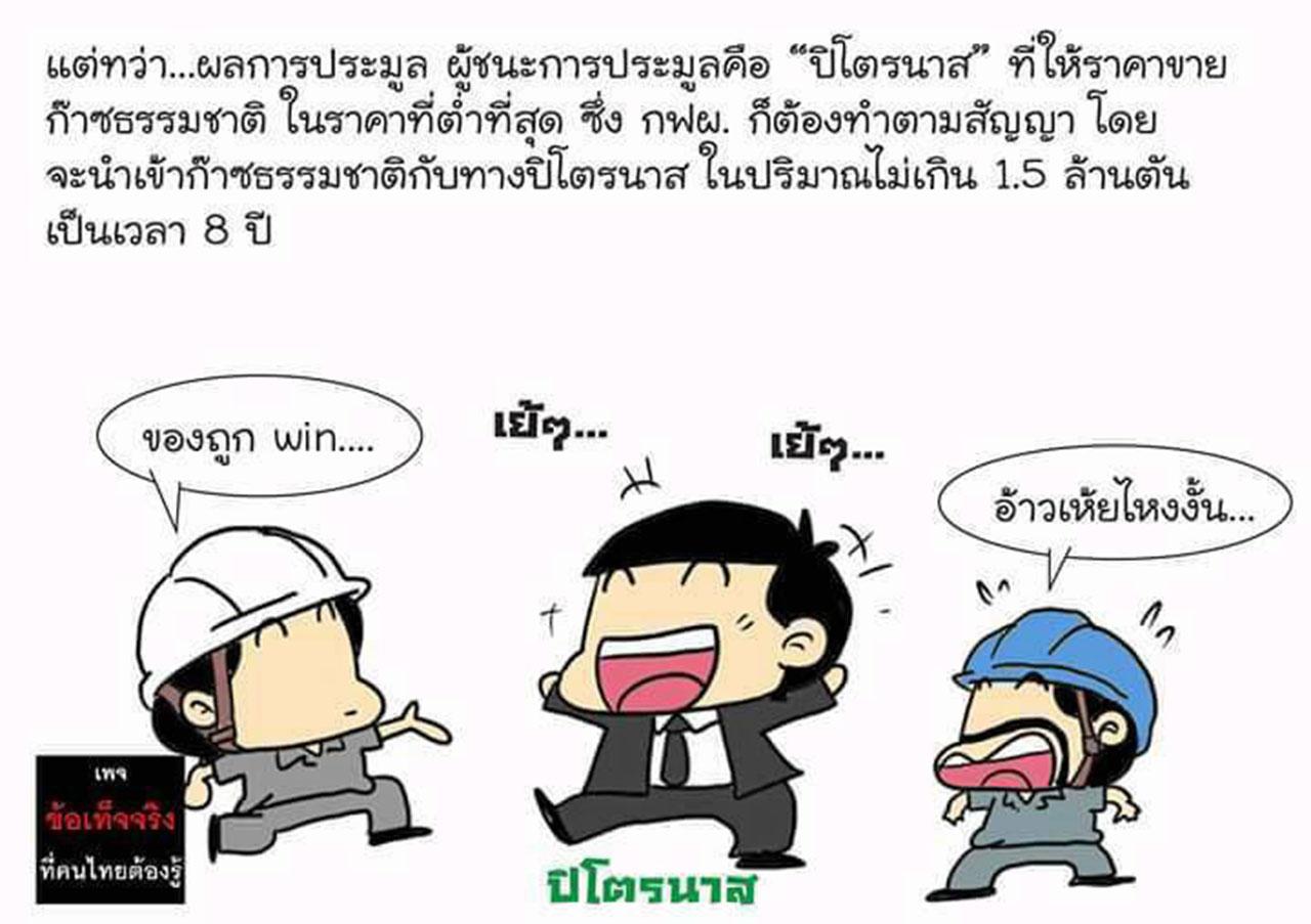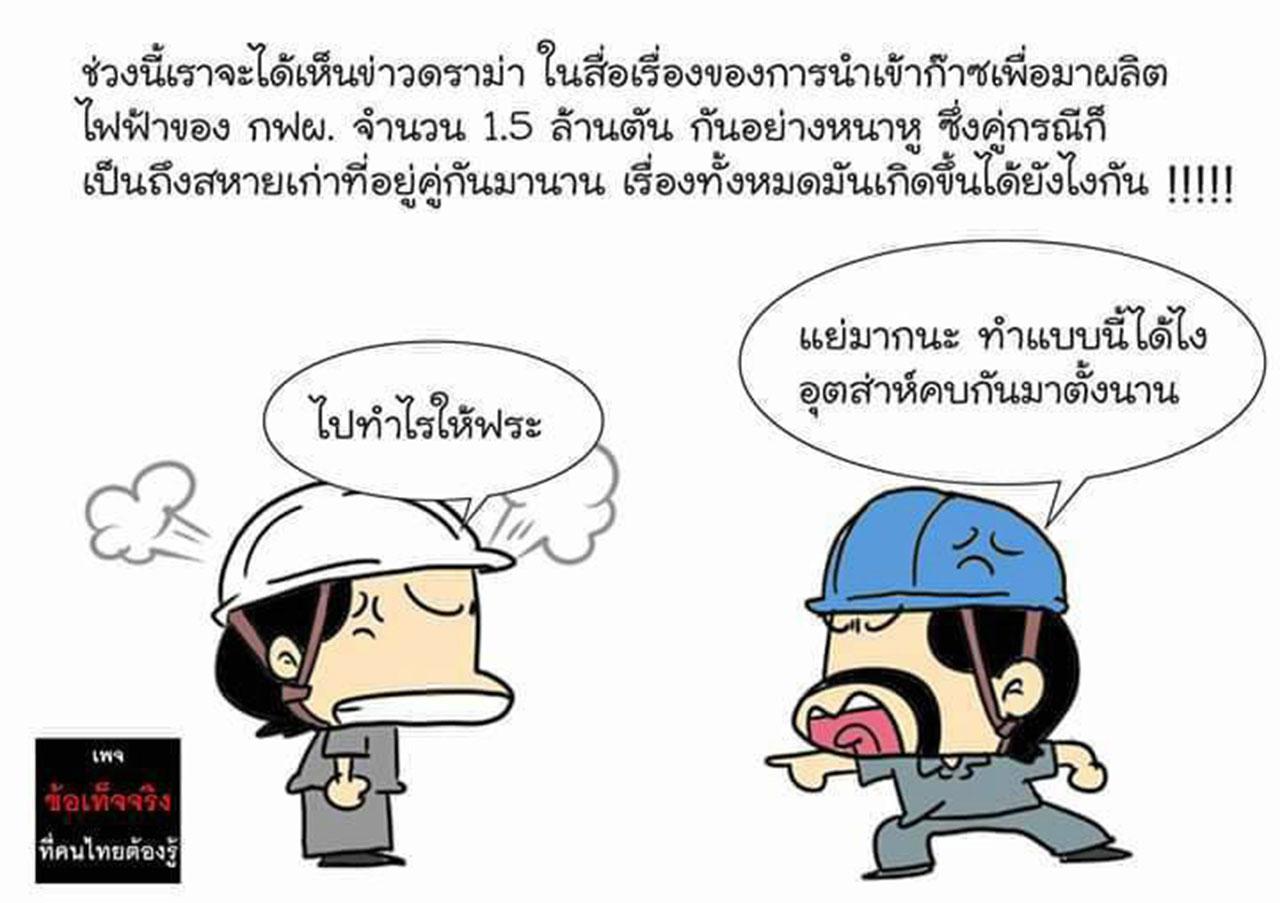 หลังจากที่นายสนธิรัตน์ สนธิจิรวงศ์ รมว.พลังงาน มีคำสั่งให้ยกเลิกแผนการนำเข้าก๊าซธรรมชาติเหลว (LNG) และให้การไฟฟ้าฝ่ายผลิตแห่งประเทศไทย (กฟผ.) ทดลองนำเข้าจากตลาดจรมาใช้ผลิตไฟฟ้า 1.5 ล้านตัน แทนการนำเข้าจากบริษัทปิโตรนาสของมาเลเซียซึ่งประมูลได้ภายใต้สัญญา 8 ปี มูลค่า 100,000 ล้านบาท ก็ให้ปรากฏมีเพจดังที่ใช้ชื่อว่า “ข้อเท็จจริงที่คนไทยต้องรู้” ได้ออกบทความเป็นภาพการ์ตูนเป็นเรื่องราวดราม่า ตีแผ่ปมของเรื่องนี้ ซึ่งคาดว่าจะเกาเหลาระหว่าง ปตท.และ กฟผ.ในอนาคต โดยมีคนเข้าไปกดแชร์ ณ วันที่ 13 ก.ย.มากว่า 8,000 ครั้งแล้ว แต่ผู้บริหาร บมจ.ปตท.ก็ยังไม่ได้มีการอธิบายเรื่องนี้