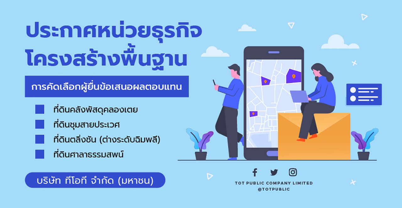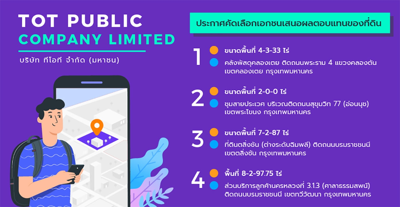 บริษัท ทีโอที จำกัด (มหาชน) เชิญชวนนักลงทุนพร้อมยื่นข้อเสนอผลตอบแทนในการพัฒนาที่ดินพื้นที่กรุงเทพฯ 3 แห่ง คือ บริเวณศาลาธรรมสพน์ ตลิ่งชัน และชุมสายประเวศ มีระยะเวลาการเช่าดำเนินการ 32 ปี (ระยะเวลาเช่า และระยะเวลาในการก่อสร้าง) โดยในส่วนของการก่อสร้างต้องไม่ขัดต่อกฎหมายผังเมือง กฎหมายควบคุมอาคาร และกฎหมายอื่นๆ ที่เกี่ยวข้อง