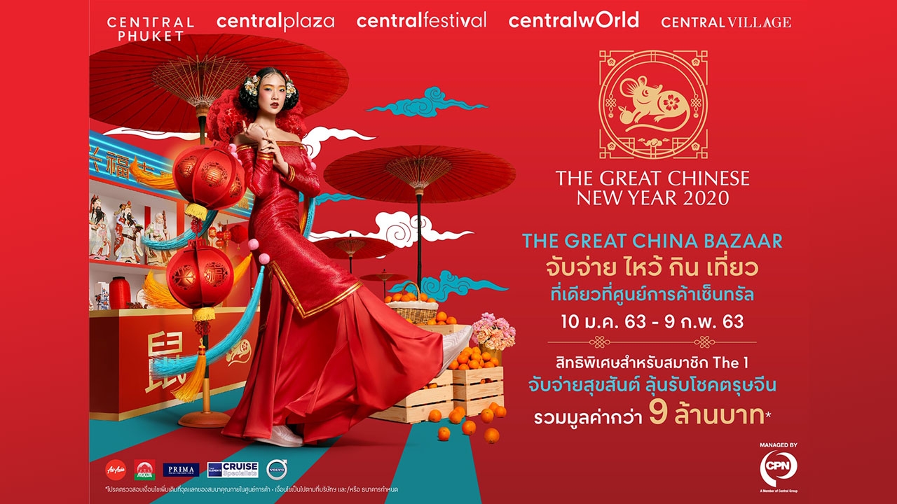 บริษัท เซ็นทรัลพัฒนา จำกัด (มหาชน) หรือ ซีพีเอ็น ร่วมกับบริษัทในเครือ และพันธมิตรธุรกิจ ทุ่มไม่อั้น เตรียมจัดงานฉลองเทศกาลตรุษจีน เทศกาลมหามงคลของชาวไทยเชื้อสายจีนทั่วประเทศ ภายใต้คอนเซปต์ The Great China Bazaar ฉลองความยิ่งใหญ่ในโอกาสครบรอบ 45 ปี ความสัมพันธ์ทางการทูตไทย-จีน อันยาวนานที่เปรียบเสมือนเมืองพี่เมืองน้อง ทั้งการแลกเปลี่ยนวัฒนธรรม และการค้าขาย เตรียมปูพรมความยิ่งใหญ่ทั่วประเทศ กระตุ้นความคึกคักการใช้จ่ายของคนไทยและนักท่องเที่ยวแดนมังกรในช่วงเทศกาลตรุษจีนด้วยไฮไลต์มากมาย เสริมความมั่งคั่งด้วยการจับจ่าย ไหว้ กิน เที่ยว ครบจบในที่เดียวอย่างแท้จริง โดยศูนย์การค้าทั้ง 33 สาขา ทั่วประเทศจะถูกจำลองให้เป็นตลาด Bazaar ในธีมต่างๆ ที่รวมสุดยอดสินค้าพื้นเมือง ของไหว้ และของมงคลล้ำค่าหายากจากประเทศจีนมาไว้ด้วยกัน อาทิ หยกมงคลล้ำค่า เครื่องปั้นดินเผา ถ้วยชามจีน ไม้แกะสลัก ถั่งเช่าคัดพิเศษ และชาจีนหายากต่างๆ เป็นต้น พร้อมลิ้มรสความอร่อยจากสุดยอดอาหารจีนจากมณฑลต่างๆ ตระการตาไปกับการแสดงระดับโลกที่หาชมได้ยากจากประเทศจีน และพลาดไม่ได้กับโปรโมชั่นร่ำรวย มงคล ลุ้นโชคมากมาย รวมมูลค่ากว่า 9 ล้านบาท ณ ศูนย์การค้าเซ็นทรัลเวิลด์, เซ็นทรัลพลาซา เซ็นทรัลเฟสติวัล เซ็นทรัลภูเก็ต และเซ็นทรัล วิลเลจ รวม 33 สาขาทั่วประเทศ ตั้งแต่วันที่ 10 ม.ค. - 9 ก.พ. 2563