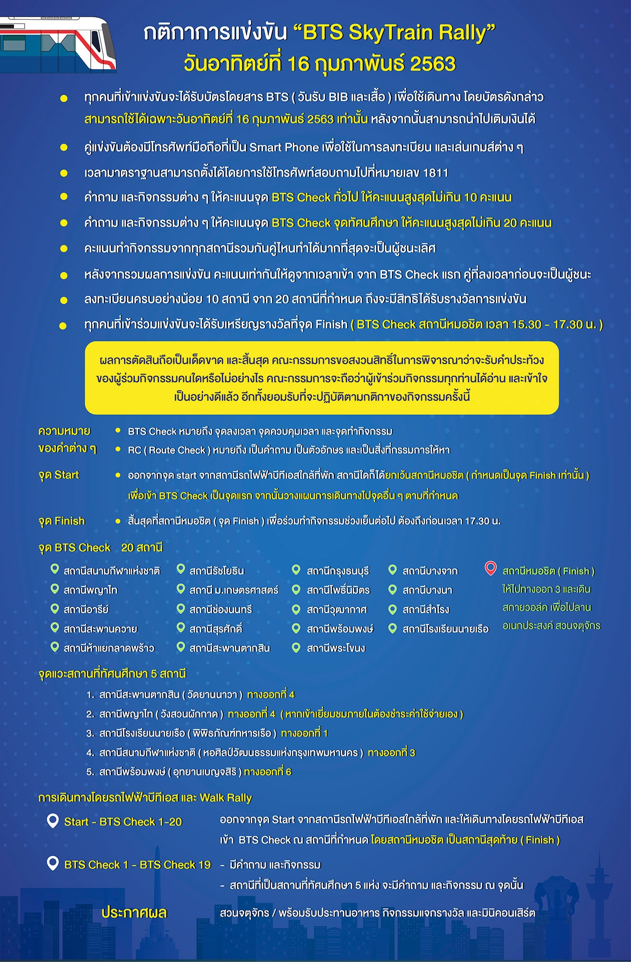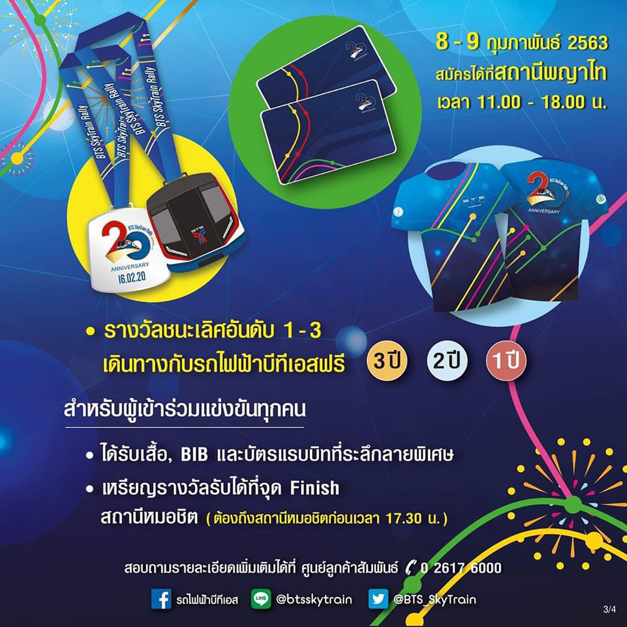 รถไฟฟ้าบีทีเอส จัดกิจกรรมแข่งขันแรลลี่บนรถไฟฟ้าเป็นครั้งแรกของประเทศไทย ฉลองให้บริการครบรอบ 20 ปี เชิญชวนผู้สนใจจับมือกันมาเป็นคู่ ร่วมสร้างประสบการณ์ทำกิจกรรมสุดสนุกตลอดเส้นทางบีทีเอส ชิงของรางวัลมากมาย รายได้ในการจัดกิจกรรมทั้งหมด โดยไม่หักค่าใช้จ่ายร่วมสมทบทุนสร้างตึกสงฆ์อาพาธ “ศรีธรรมราชา” จังหวัดนครศรีธรรมราช