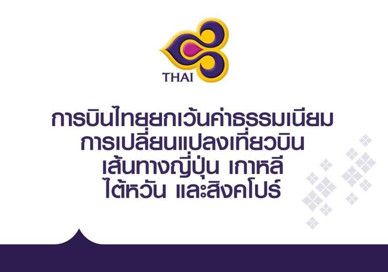 การบินไทย ประกาศยกเว้นค่าธรรมเนียมการเปลี่ยนแปลงเที่ยวบินเส้นทางญี่ปุ่น เกาหลี ไต้หวัน และสิงคโปร์ สำหรับผู้ที่ออกบัตรเดินทางก่อน 18 ก.พ.63 และเดินทางช่วงระหว่างวันที่ 18ก.พ.-31 มี.ค.63