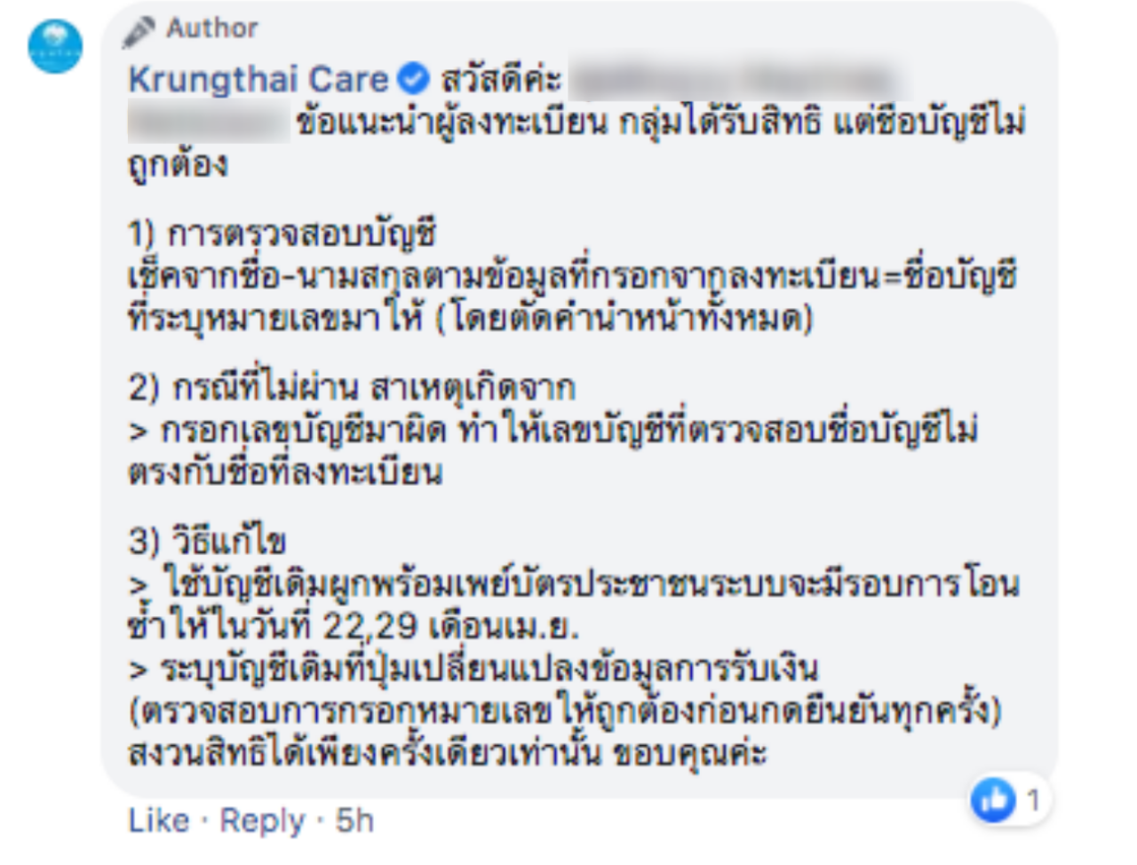 ทั้งนี้ แอดมินแฟนเพจ Krungthai Care ระบุว่า ข้อแนะนำผู้ลงทะเบียน กลุ่มได้รับสิทธิ แต่ชื่อบัญชีไม่ถูกต้อง
