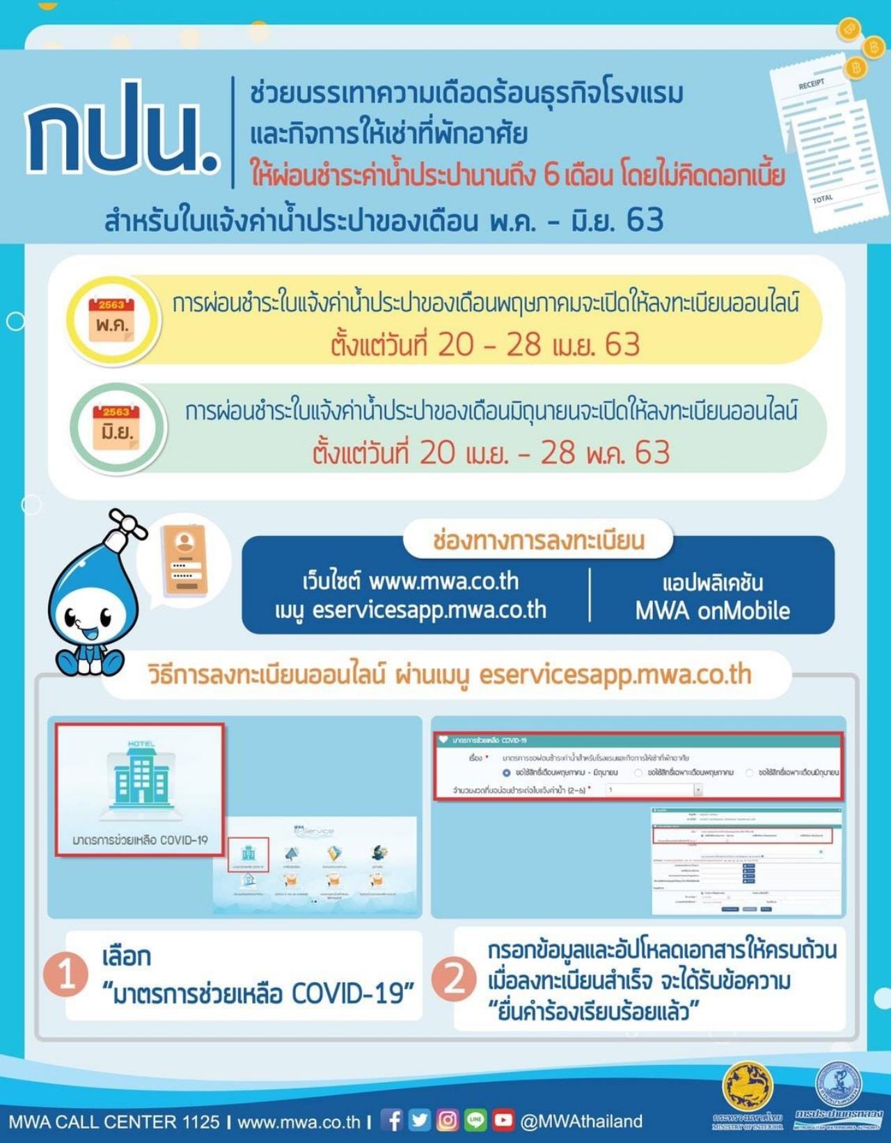 วันที่ 19 เม.ย. 2563 การประปานครหลวง (กปน.) ขยายระยะเวลาการชำระค่าน้ำประปา สำหรับผู้ใช้น้ำที่จดทะเบียนประกอบธุรกิจโรงแรม และกิจการที่ให้เช่าพักอาศัย สามารถผ่อนชำระค่าน้ำประปาได้นานถึง 6 เดือน โดยไม่มีดอกเบี้ย สำหรับใบแจ้งค่าน้ำประปาของเดือนพฤษภาคม-มิถุนายน 2563 เริ่มลงทะเบียนออนไลน์เพื่อขอผ่อนชำระค่าน้ำได้ตั้งแต่วันที่ 20 เมษายน 2563 ผู้ใช้น้ำสามารถกดเลือกในระบบได้ว่าจะขอใช้สิทธิ์ผ่อนชำระค่าน้ำเฉพาะของเดือนพฤษภาคม หรือมิถุนายน ทั้งนี้ ผู้ใช้น้ำสามารถเลือกขอใช้สิทธิ์ผ่อนชำระค่าน้ำได้ทั้ง 2 เดือน พร้อมระบุจำนวนงวดที่ต้องการจะผ่อนชำระที่ www.mwa.co.th เมนู eservicesapp.mwa.co.th และแอปพลิเคชัน MWA onMobile