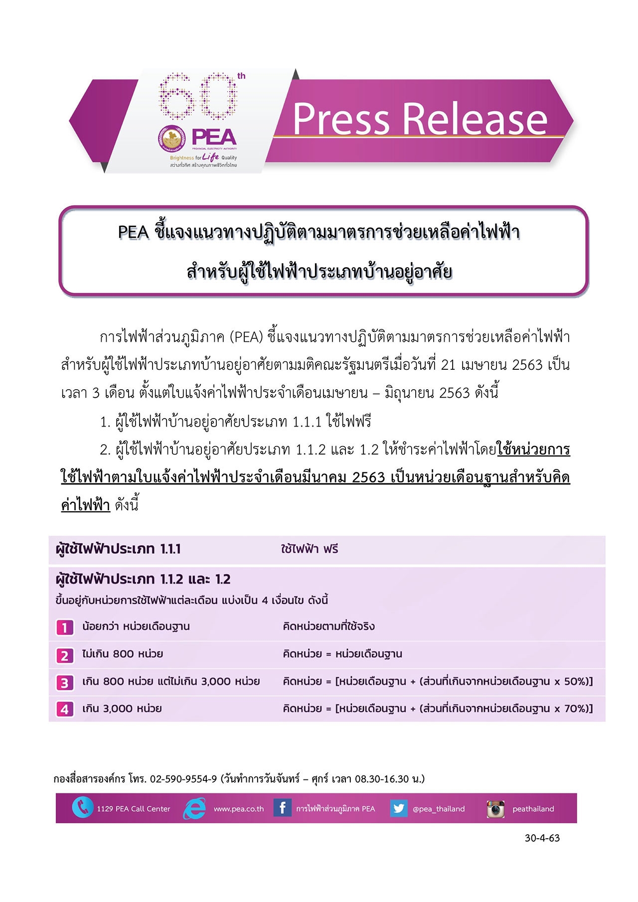 การไฟฟ้าส่วนภูมิภาค (PEA) ชี้แจงแนวทางปฏิบัติตามมาตรการช่วยเหลือค่าไฟฟ้าสำหรับผู้ใช้ไฟฟ้าประเภทบ้านอยู่อาศัยตามมติคณะรัฐมนตรีเมื่อวันที่ 21 เมษายน 2563 เป็นเวลา 3 เดือน ตั้งแต่ใบแจ้งค่าไฟฟ้าประจำเดือนเมษายน – มิถุนายน 2563 ดังนี้