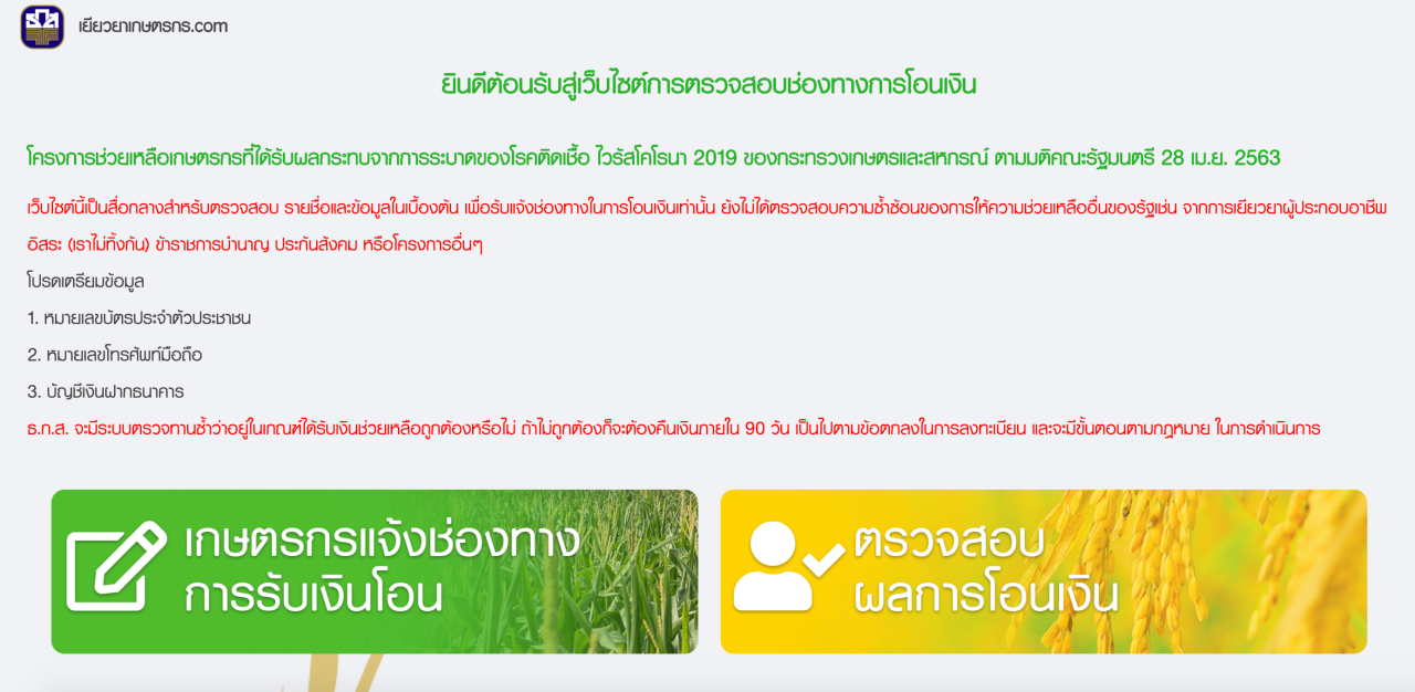 จากกรณี ธนาคารเพื่อการเกษตรและสหกรณ์การเกษตร (ธ.ก.ส.) เริ่มโอนเงินเยียวยา 5,000 บาท รวม 3 เดือน (พ.ค.-ก.ค.) ให้แก่เกษตรกรที่ขึ้นทะเบียน 10 ล้านราย วงเงินงบประมาณจำนวน 150,000 ล้านบาท โดยได้เปิดให้ลงทะเบียนผ่าน www.เยียวยาเกษตรกร.com โดยเริ่มทยอยโอนเงินตั้งแต่วันที่ 15 พ.ค.ที่ผ่านมาแล้ว