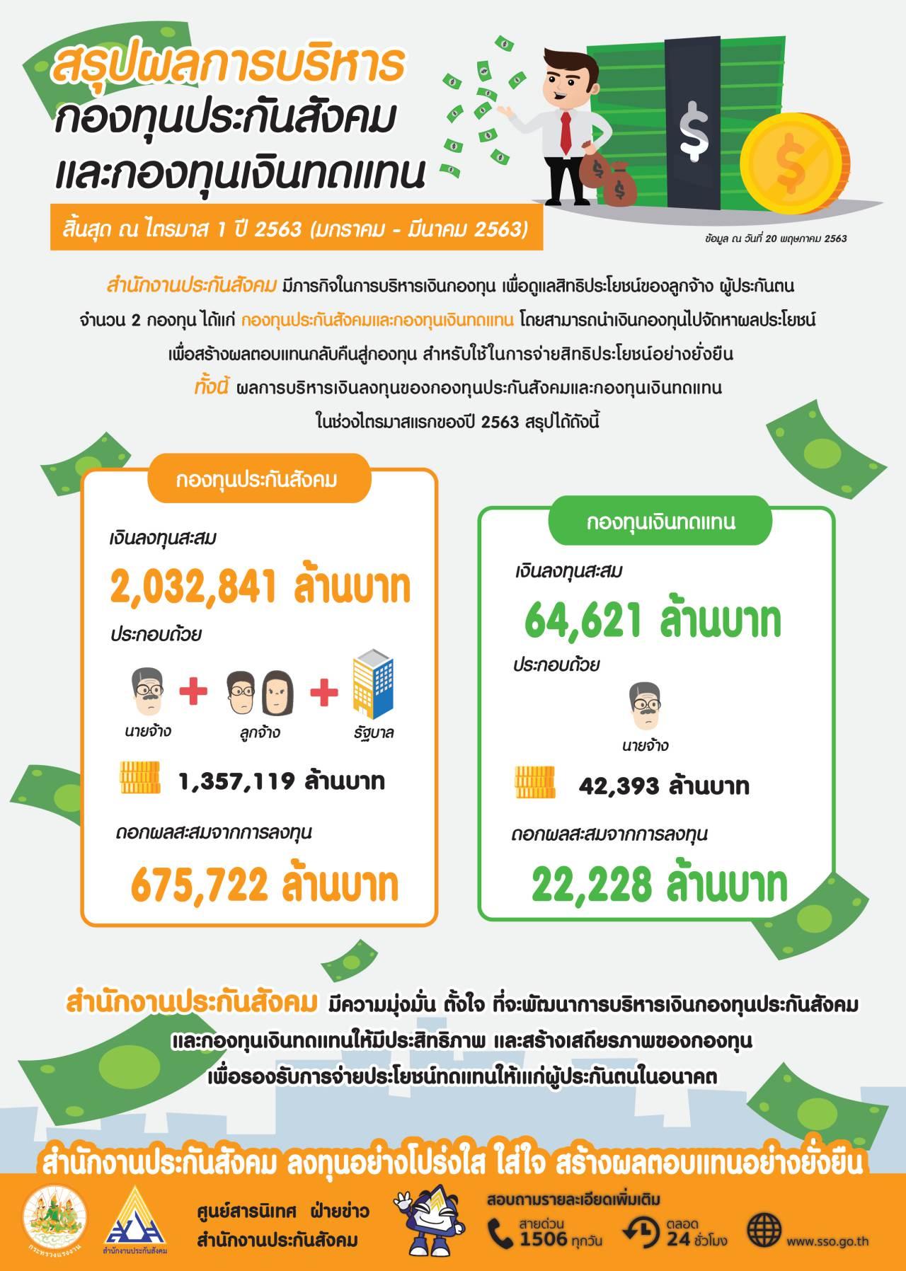 ทั้งนี้ หากรวมเงินลงทุน "กองทุนประกันสังคม" และ "กองทุนเงินทดแทน" ในไตรมาส 1 ปี 2563 สำนักงานประกันสังคม สามารถสร้างผลตอบแทนจากการลงทุนได้สูงถึง 10,283 ล้านบาท