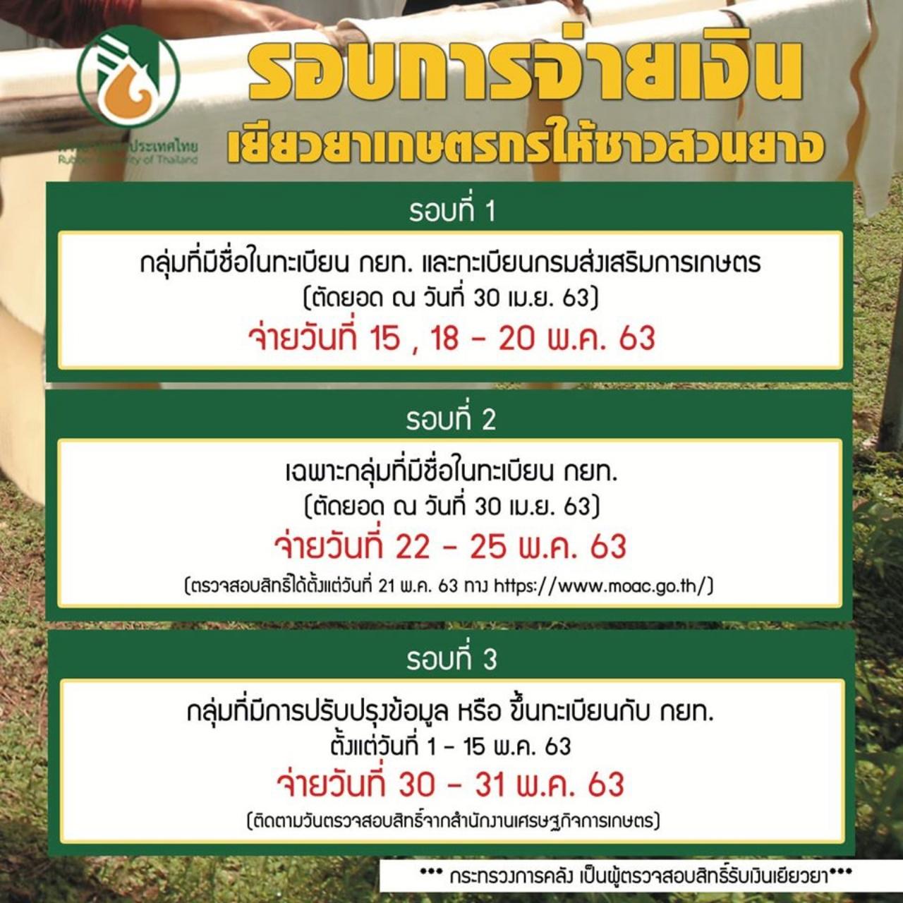 ชาวสวนยางกลุ่มที่ 2 เฉพาะกลุ่มที่มีชื่อขึ้นทะเบียนกับ กยท. (ตัดยอด วันที่ 30 เม.ย.63) จะจ่ายเงินในวันที่ 22-25 พ.ค.63