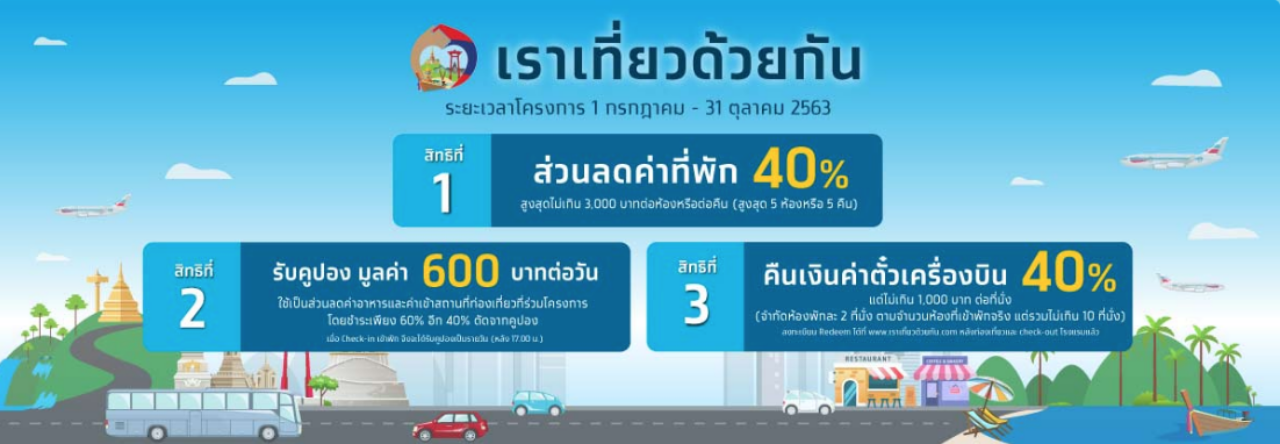 จากกรณี ครม.มีมติอนุมัติงบประมาณให้การท่องเที่ยวแห่งประเทศไทย (ททท.) ดำเนินการฟื้นฟูเศรษฐกิจด้านการท่องเที่ยว หลังจากได้รับผลกระทบจากโควิด-19 มีระยะเวลาทำโครงการ 4 เดือน ตั้งแต่ 1 ก.ค.-31 ต.ค. 63 ซึ่งโครงการ "เราเที่ยวด้วยกัน" เป็นการเปลี่ยนชื่อใหม่จากการรวมโครงการ "เราไปเที่ยวกัน" และ "เที่ยวปันสุข" ให้อยู่ในโครงการเดียว โดยมี 3 รายการย่อย คือ รัฐสนับสนุนค่าใช้จ่ายโรงแรมที่พัก 40% ของราคาที่พักต่อห้องต่อคืน (ไม่เกิน 3,000 บาท ต่อห้องต่อคืน) และสนับสนุนค่าตั๋วเครื่องบิน 2 ล้านใบ โดยผู้จองที่พักมีสิทธิ์ได้รับเงินสนับสนุนค่าบัตรโดยสาร ในลักษณะการจ่ายเงินคืนผ่านแอปพลิเคชัน "เป๋าตัง" 40% แต่ไม่เกิน 1,000 บาทต่อที่นั่ง และจองที่พัก 1 ห้องจะได้รับสิทธิ์บัตรโดยสารไม่เกิน 2 ใบ ส่วนรถเช่าและรถโดยสารไม่ประจำทางยกเลิกการสนับสนุนเนื่องจากตรวจสอบการเดินทางข้ามจังหวัดไม่ได้