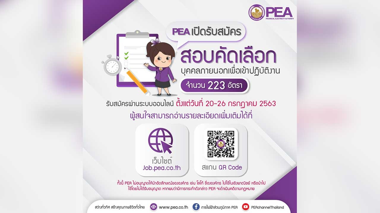 การไฟฟ้าส่วนภูมิภาค เปิดรับสมัครคัดเลือกบุคคลภายนอกเพื่อเข้าปฏิบัติงานในพื้นที่ของการไฟฟ้าส่วนภูมิภาคทั่วประเทศ จำนวน 223 อัตรา โดยจะเปิดรับสมัครผ่านระบบออนไลน์ ตั้งแต่วันที่ 20-26 กรกฎาคม 2563 (ไม่เว้นวันหยุดราชการ) ผู้สนใจสามารถศึกษารายละเอียดได้ทางเว็บไซต์ http://job.pea.co.th หรือ QR Code