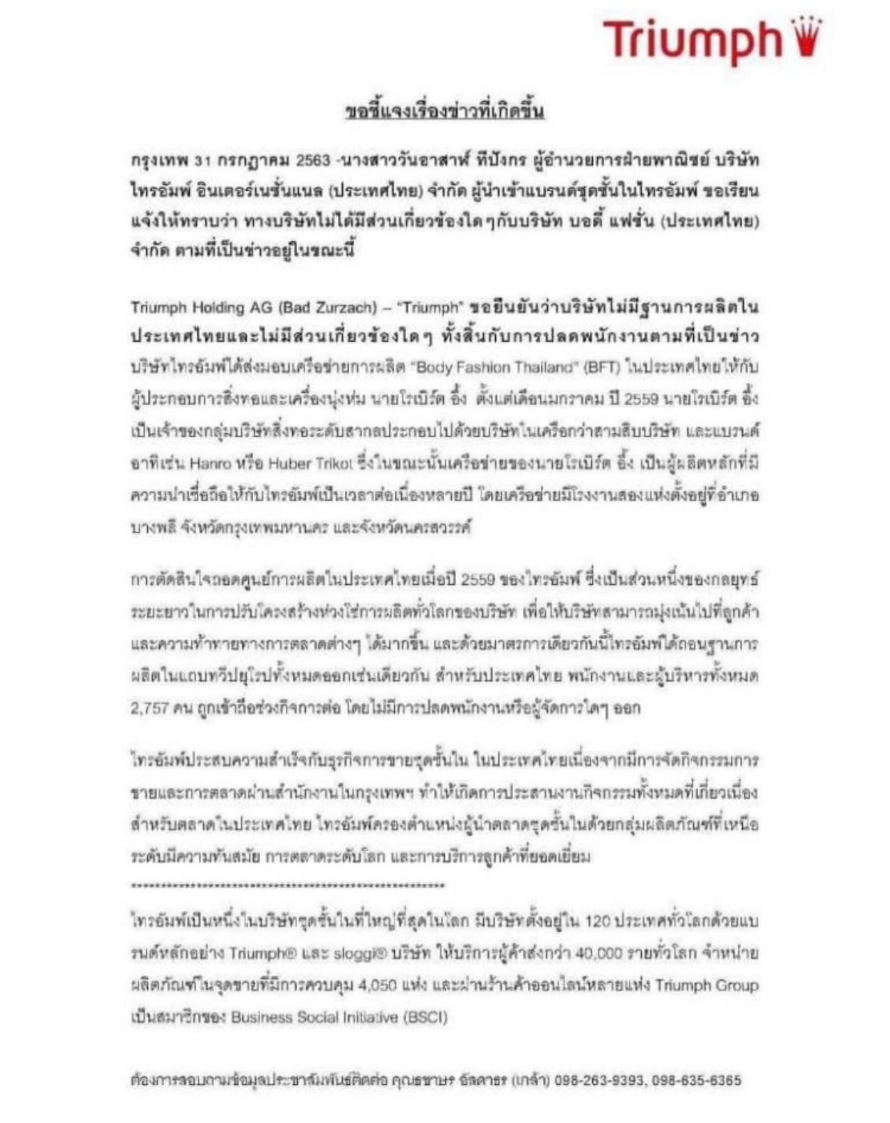 ซึ่ง Triumph ไม่มีฐานการผลิตในประเทศไทย และไม่มีส่วนเกี่ยวข้องใดๆ ทั้งสิ้นกับการปลดพนักงานตามที่เป็นข่าว โดยบริษัทไทรอัมพ์ ได้ส่งมอบเครือข่ายการผลิต “Body Fashion Thailand” (BFT) ในประเทศไทยให้กับผู้ประกอบการสิ่งทอและเครื่องนุ่งห่มของ นายโรเบิร์ต อึ้ง ตั้งแต่เดือนมกราคม ปี 2559