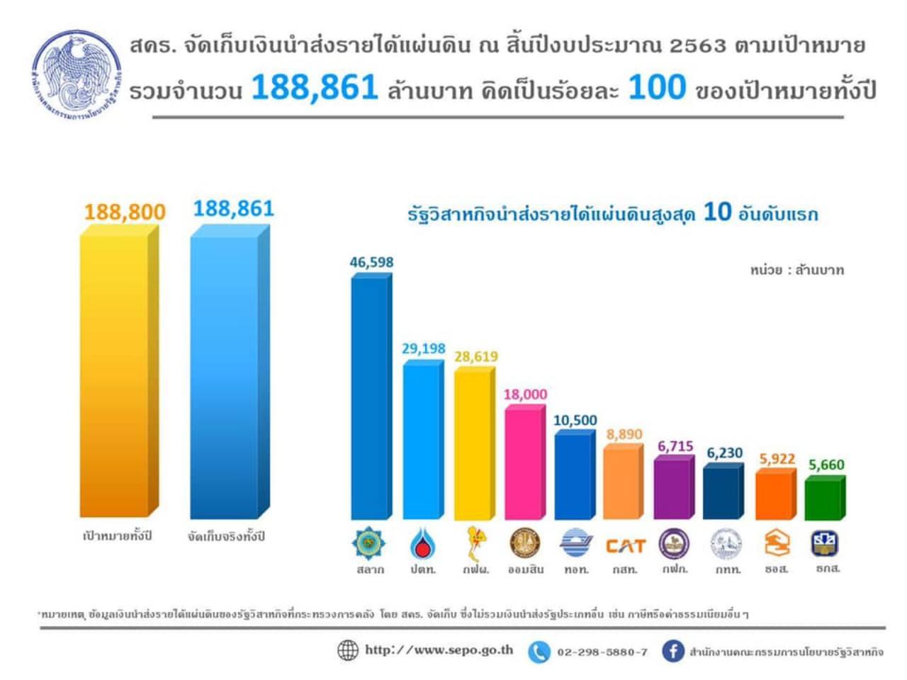 ทั้งนี้ จึงส่งผลให้ ณ สิ้นปีงบประมาณ 63 (ตั้งแต่วันที่ 1 ต.ค.62 – 30 ก.ย. 63) มีเงินนำส่งรายได้แผ่นดินจากรัฐวิสาหกิจและกิจการฯ รวมจำนวน 188,861 ล้านบาท เป็นไปตามเป้าหมายเงินนำส่งรายได้แผ่นดินตามเอกสารงบประมาณจำนวน 188,800 ล้านบาท