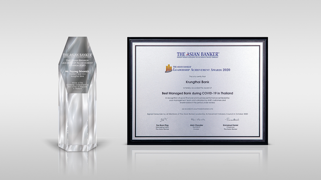 ความจริงข้อหนึ่งที่เราต่างยอมรับว่าเมื่อเกิดการเปลี่ยนแปลงขึ้น มันย่อมมีความท้าทายและความเสี่ยง ความรวดเร็วในการแก้ไขปัญหาเป็นสิ่งสำคัญ ซึ่งธนาคารกรุงไทยเองได้พิสูจน์ให้เห็นว่าสามารถก้าวผ่านวิกฤตนั้นมาได้พร้อมกับทุกคนโดยไม่ทิ้งใครไว้ข้างหลัง จนได้รับรางวัลการันตีจาก The Asian Banker นิตยสารชั้นนำด้านการเงินการธนาคารในภูมิภาคเอเชียถึง 2 รางวัลด้วยกัน ได้แก่ The Asian Banker Leadership Achievement Award for Best Managed Bank และ Best CEO Response to COVID-19 in Thailand