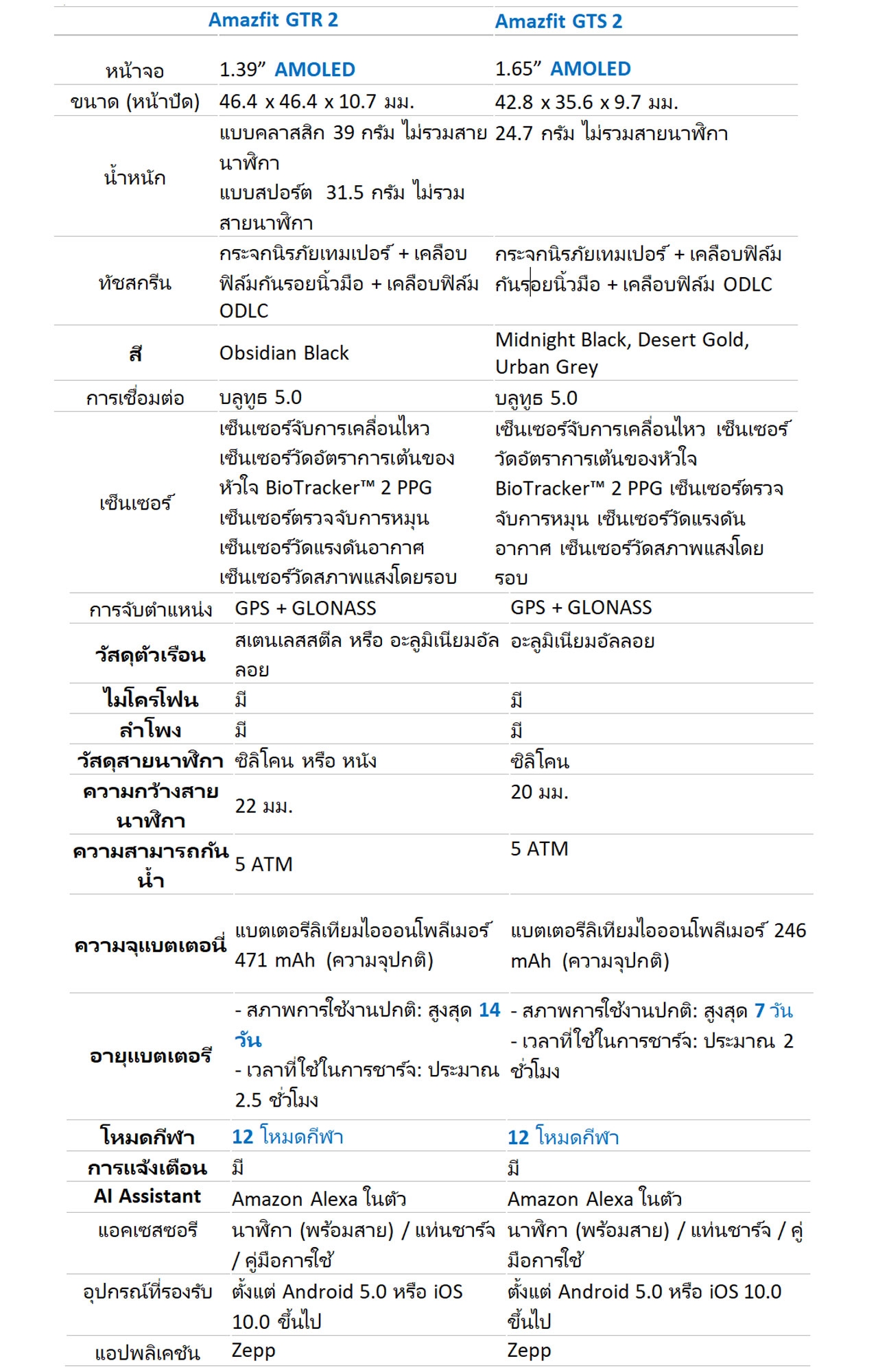 อเมซฟิต จีทีเอส 2 ราคา 5,599 บาท มีให้เลือก 3 สี ได้แก่ Midnight Black, Desert Gold และ Urban Grey