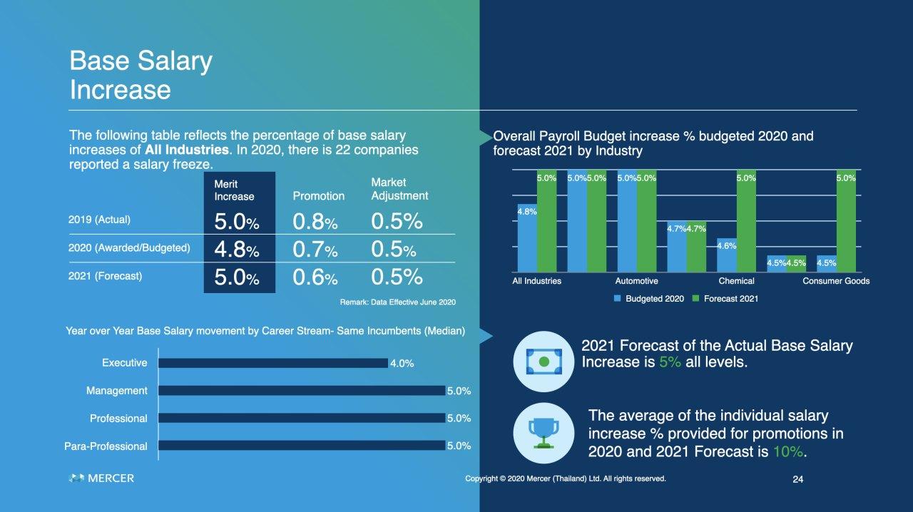 อัตราการขึ้นเงินเดือนที่ประมาณการไว้นี้เกิดขึ้นจากภาพรวมเศรษฐกิจของประเทศไทยที่ถดถอย โดยคาดว่าผลผลิตมวลรวมภายในประเทศ หรือ GDP จะ -7.8% ในปี 2563 แม้มีการคาดการณ์ว่าเศรษฐกิจจะกระเตื้องขึ้น 3.5% ในปี 2564 ก็ตาม หากอนาคตก็ยังคงไม่แน่นอน