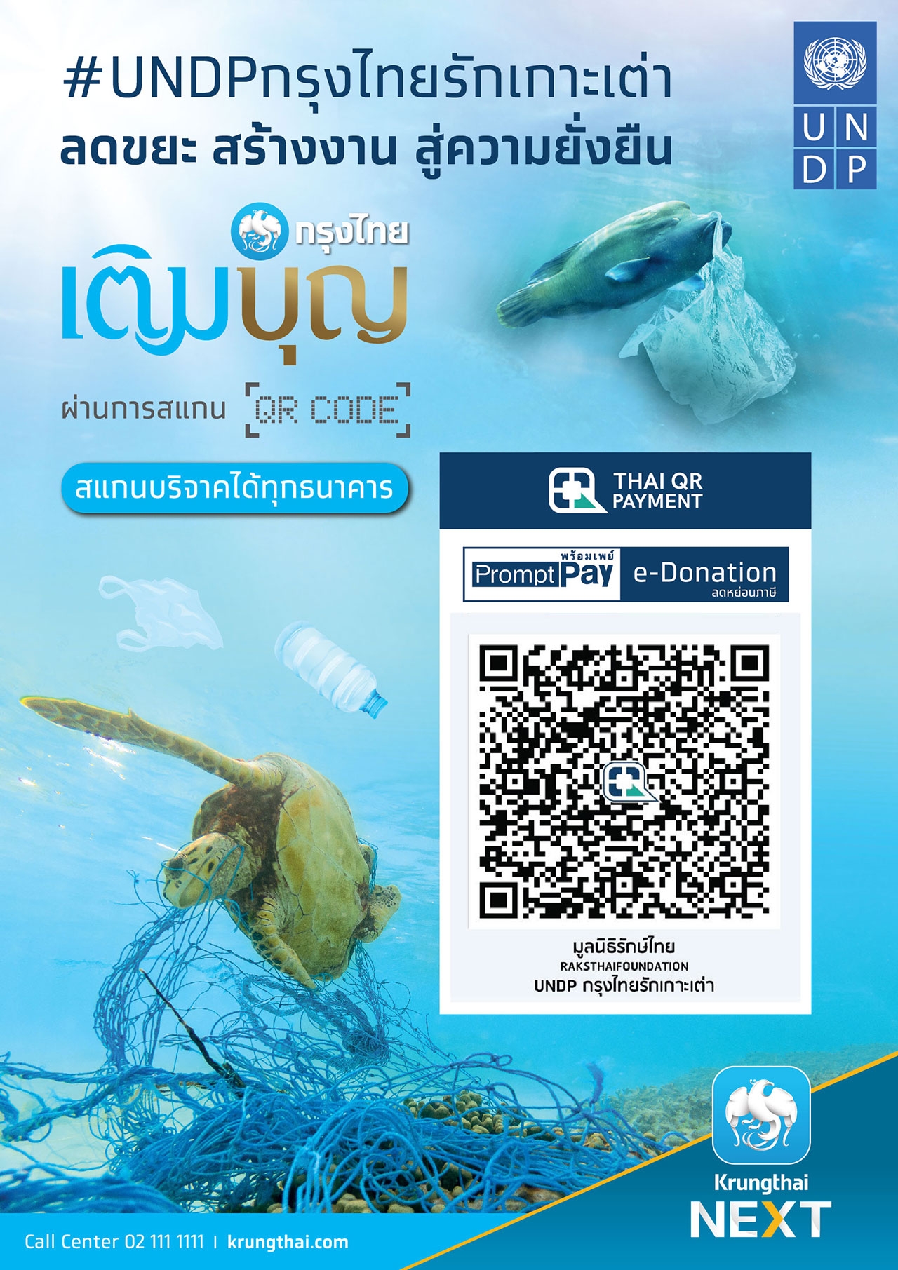 ภารกิจสำคัญของธนาคารกรุงไทย คือ การร่วมขับเคลื่อนเศรษฐกิจของประเทศ ควบคู่กับการสร้างการเติบโตของธุรกิจเพื่อก้าวสู่ Digital Banking เต็มรูปแบบ ที่สามารถตอบโจทย์ทุกไลฟ์สไตล์ของลูกค้าในยุค Technology Disruption บนพื้นฐานของการดำเนินธุรกิจอย่างรับผิดชอบต่อสิ่งแวดล้อม สังคมและธรรมาภิบาล (ESG) โดยด้านสิ่งแวดล้อม ได้ส่งเสริมการสร้างอาชีพให้คนในชุมชนทำความสะอาดและเก็บขยะ เพื่อนำไปสร้างมูลค่าเพิ่มโดยทำอุปกรณ์เครื่องใช้ต่างๆ เช่น เฟอร์นิเจอร์ และในต้นปี 2564 ธนาคารจะนำขวดพลาสติกมาแปรรูปเป็นเส้นใยเพื่อผลิตเสื้อ #UNDP กรุงไทยรักเกาะเต่า และรณรงค์ให้พนักงานกว่า 20,000 คนทั่วประเทศ ร่วมอุดหนุนเสื้อ โดยขวดพลาสติกจำนวน 8 ขวด สามารถผลิตเสื้อได้ 1 ตัว ตั้งเป้าลดปริมาณขยะกว่า 160,000 ชิ้น และนำรายได้หลังจากหักค่าใช้จ่ายสมทบทุนให้กับชาวเรือเกาะเต่า ด้านสังคม ธนาคารได้ลงพื้นที่ช่วยเหลือลูกค้า ผู้ประกอบการในเกาะเต่า ด้วยการสนับสนุนสินเชื่อผ่านมาตรการต่างๆ อย่างเต็มที่ และได้เชิญชวนเข้าร่วมโครงการเราเที่ยวด้วยกัน เชิญชวนร้านค้าเข้าร่วมโครงการคนละครึ่ง เพื่อสนับสนุนการท่องเที่ยวและกระตุ้นการใช้จ่ายในประเทศ และในด้านธรรมาภิบาล การระดมทุนในครั้งนี้สามารถตรวจสอบได้ ซึ่งข้อมูลที่ประชาชนบริจาคจะถูกส่งเข้าระบบลดหย่อนภาษีของกรมสรรพากรโดยอัตโนมัติ และธนาคารได้ร่วมสนับสนุนโครงการในฐานะผู้บริจาคเริ่มต้น 30 เปอร์เซ็นต์ เพื่อให้โครงการสามารถขับเคลื่อนและประชาชนได้รับความช่วยเหลืออย่างแท้จริง