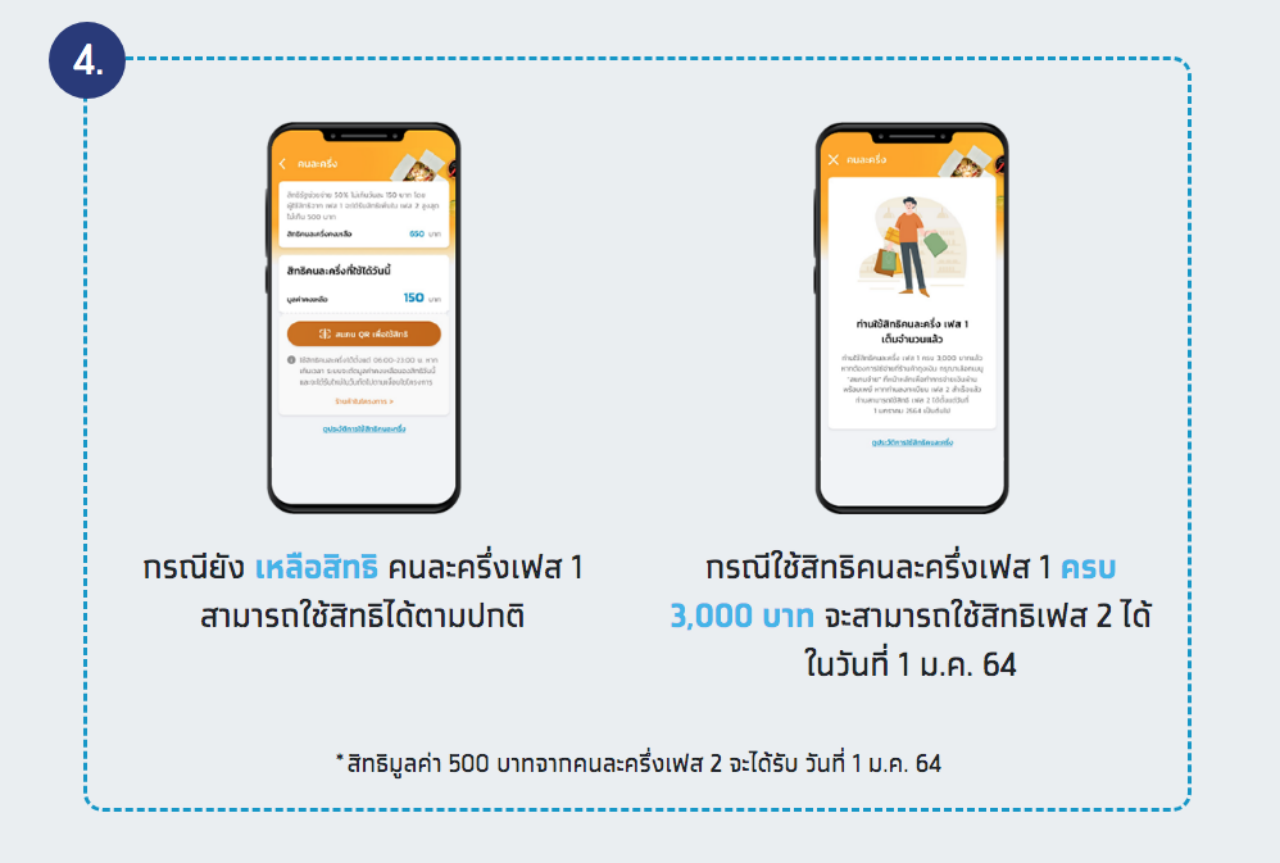 โดยสำหรับผู้ได้รับสิทธิ์โครงการคนละครึ่งกลุ่มเดิม จะใช้จ่ายวงเงิน 3,000 บาทเดิม ที่เคยได้รับมาอยู่ในแอปฯเป๋าตัง ได้จนถึงวันที่ 31 มี.ค. 2564 และใช้จ่ายวงเงินใหม่ เพิ่มอีก 500 บาท ได้ตั้งแต่วันที่ 1 ม.ค.-31 มี.ค. 2564 ซึ่งเงื่อนไขการใช้จ่ายก็ยังคงเป็นแบบเดิมคือ ใช้จ่ายได้ไม่เกินวันละ 150 บาท โดยรัฐจะออกให้อีก 150 บาท เท่ากับว่าในแต่ละวัน เราจะสามารถใช้จ่ายได้ 300 บาท ผ่านแอปฯเป๋าตังในร้านค้าที่เข้าร่วมโครงการ