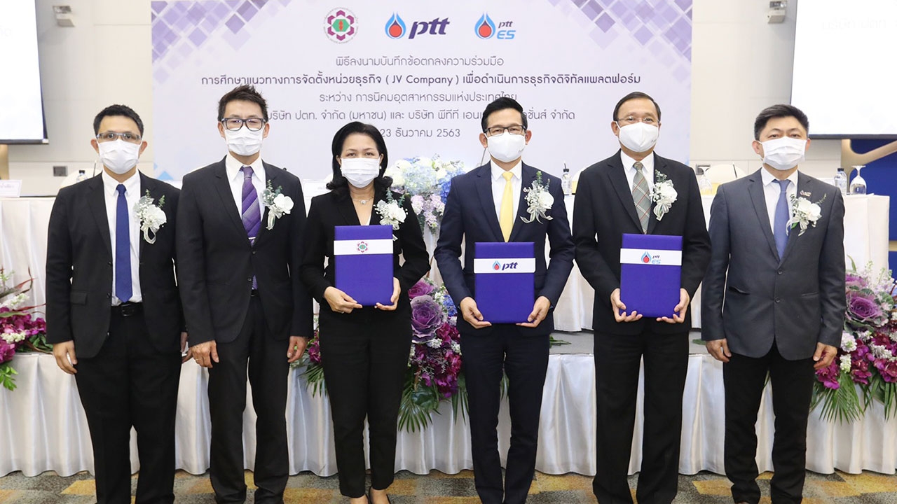 นายอรรถพล ฤกษ์พิบูลย์ ประธานเจ้าหน้าที่บริหารและกรรมการผู้จัดการใหญ่ บริษัท ปตท. จำกัด (มหาชน) นางสาวสมจิณณ์ พิลึก ผู้ว่าการการนิคมอุตสาหกรรมแห่งประเทศไทย และนายพิชัยรัตน์ จิรานันรัตน์ กรรมการผู้จัดการ บริษัท พีทีที เอนเนอร์ยี่ โซลูชั่นส์ จำกัด ลงนามในบันทึกข้อตกลงความร่วมมือการศึกษาแนวทางการจัดตั้งหน่วยธุรกิจ (JV Company) เพื่อดำเนินการธุรกิจดิจิทัลแพลตฟอร์มร่วมกัน ระหว่าง บริษัท ปตท. จำกัด (มหาชน) การนิคมอุตสาหกรรมแห่งประเทศไทย และ บริษัท พีทีที เอนเนอร์ยี่ โซลูชั่นส์ จำกัด โดยมี นายวิทวัส สวัสดิ์ชูโต ประธานเจ้าหน้าที่เทคโนโลยีและวิศวกรรม บริษัท ปตท. จำกัด (มหาชน) นายอัฐพล จิรวัฒน์จรรยา รองผู้ว่าการการนิคมอุตสาหกรรมแห่งประเทศไทย และนายเกียรติศักดิ์ เพ็ชรน้ำเขียว ผู้จัดการฝ่าย Strategic & Business Transformation Development