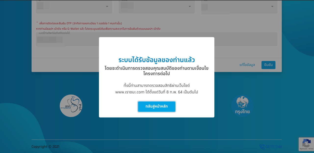 8. เสร็จแล้วจะขึ้นข้อความว่า "ระบบได้รับข้อมูลของท่านแล้ว โดยจะดำเนินการตรวจสอบคุณสมบัติของท่านตามเงื่อนไขโครงการต่อไป ทั้งนี้ท่านสามารถตรวจสอบสิทธิ์ผ่านเว็บไซต์ www.เราชนะ.com ได้ตั้งแต่วันที่ 8 กุมภาพันธ์ 2564 เป็นต้นไป" แล้วคลิกคำว่า "กลับสู่หน้าหลัก" เป็นอันเสร็จการลงทะเบียน.