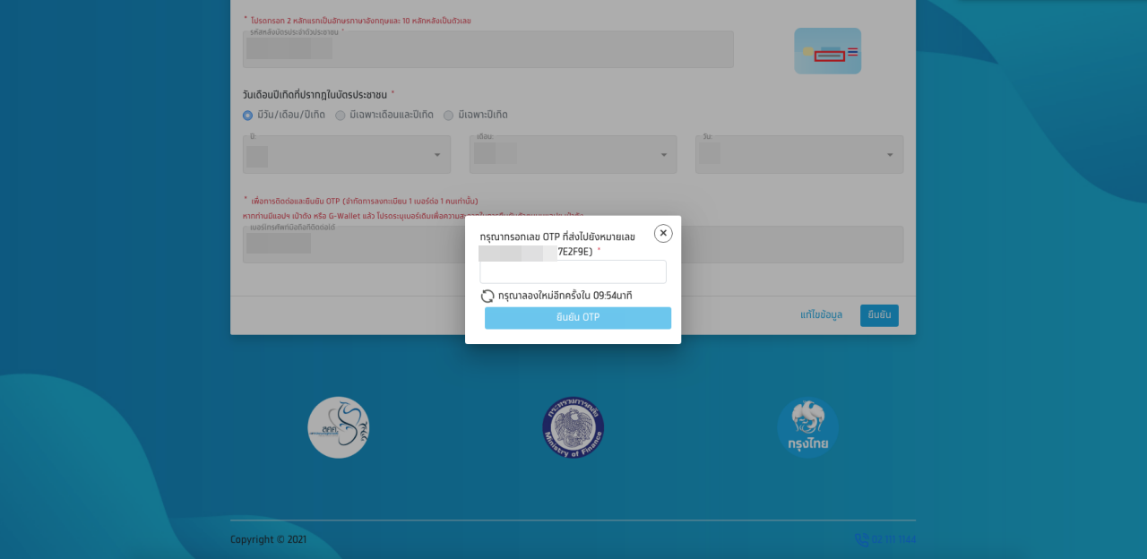 7. จากนั้นระบบจะให้กรอกเลข OTP ที่ส่งไปยังหมายเลขโทรศัพท์ที่ท่านลงทะเบียนไว้ โดยเป็นหมายเลข 6 ตัว เมื่อกรอกเสร็จให้คลิก "ยืนยัน OTP"