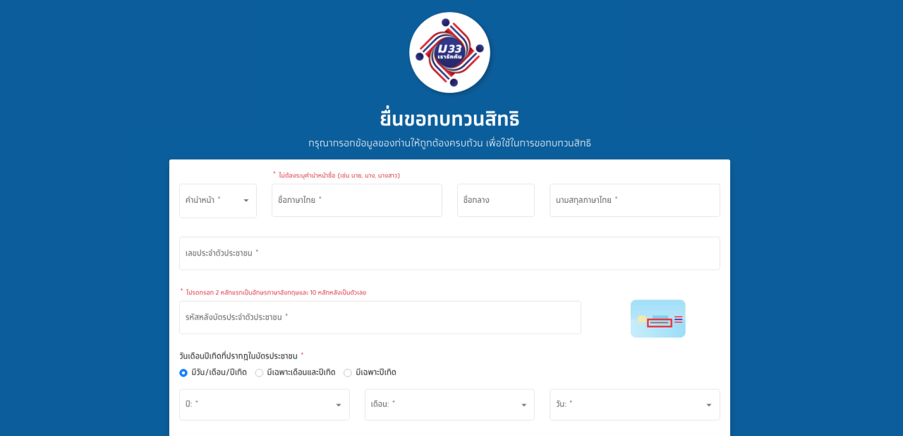 ส่วนกรณีที่ผู้ประกันตนตรวจสอบสิทธิ์แล้วไม่ได้รับสิทธิ์ตามโครงการ ม.33 เรารักกัน สามารถขอทบทวนสิทธิ์ผ่านเว็บไซต์ www.ม33เรารักกัน.com ได้ตั้งแต่ 15-28 มี.ค.64 ในเวลา 06.00-23.00 น. โดยขอให้ผู้ประกันตนกดเข้าไปที่เมนู "ทบทวนสิทธิ์" (ปุ่มสีเหลือง) หลังจากนั้นกรอกข้อมูลส่วนบุคคลเพื่อใช้ในการทบทวนสิทธิ์ให้ละเอียดชัดเจน เช่น ชื่อ-สกุล, เลขบัตรประจำตัวประชาชน และรหัสหลังบัตร, วัน/เดือน/ปีเกิด, จังหวัดที่พักอาศัย, เบอร์โทรศัพท์ จากนั้นคลิกปุ่ม "ขอทบทวนสิทธิ์"