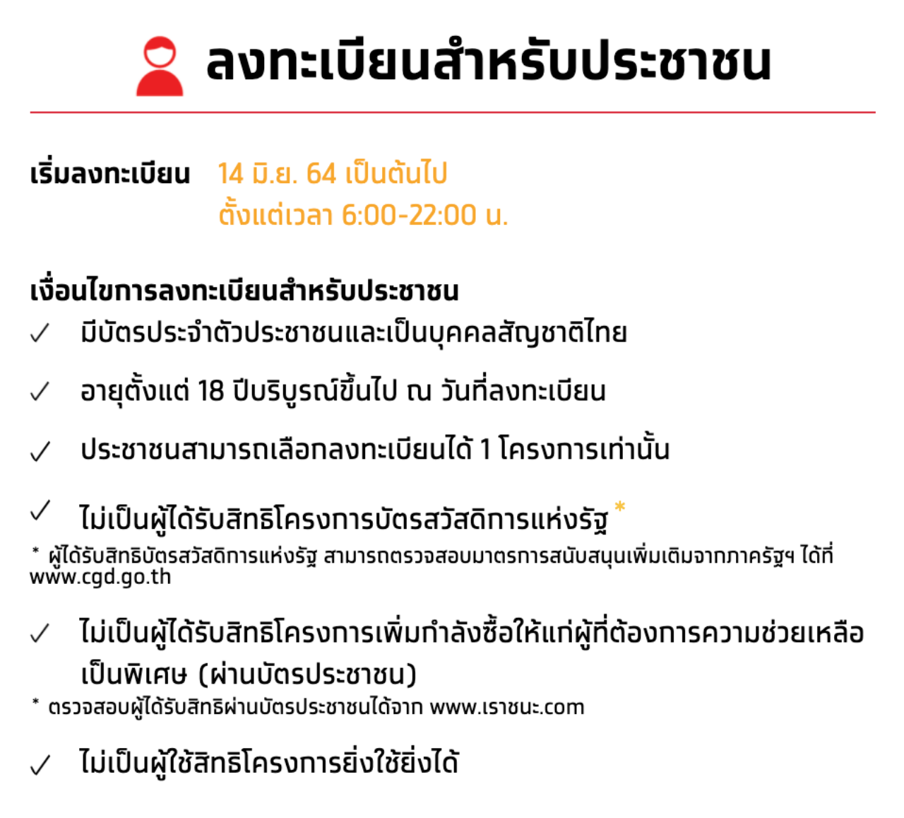อย่างไรก็ตาม ประชาชนที่สนใจลงทะเบียนเข้าร่วมโครงการ คนละครึ่ง ระยะที่ 3 สามารถลงทะเบียนผ่าน www.คนละครึ่ง.com ได้ตั้งแต่เวลา 06.00 น. – 22.00 น. วันที่ 14 มิถุนายน 2564 เป็นต้นไป.