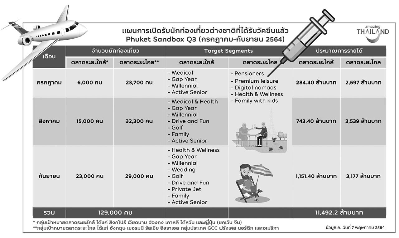หรือพื้นที่ท่องเที่ยวที่อยากเปิดในเดือน ส.ค. แบบไม่ต้องกักตัวนักท่องเที่ยว ได้แก่ เขาหลัก จ.พังงา, เกาะลันตา อ่าวนาง ทับแขก จ.กระบี่ และ อ.เมือง อ.แม่ริม อ.แม่แตง และดอยเต่า จ.เชียงใหม่ ที่ขอกักตัว 7 วันและเที่ยวแบบจำกัดพื้นที่ อีกทั้งในเดือน ต.ค.จะขยายการเปิดรับนักท่องเที่ยวแบบไม่กักตัวที่พัทยา จ.ชลบุรี กรุงเทพฯ ชะอำ หัวหิน และ จ.บุรีรัมย์ ที่จะมีการจัดการแข่งขันโมโต จีพี