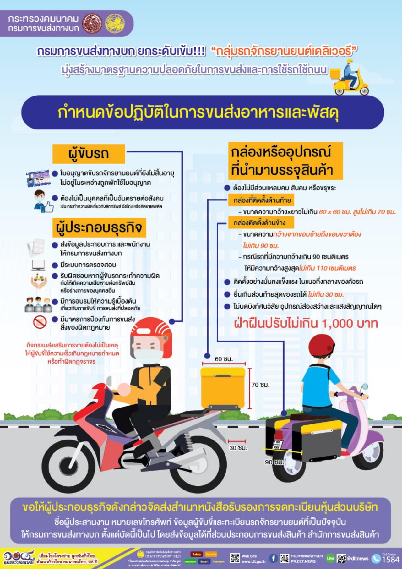 ขนส่งทางบก เล็งยกระดับมาตรฐาน "กลุ่มรถจักรยานยนต์เดลิเวอรี่" กำหนดข้อปฏิบัติในการขนส่งอาหารและพัสดุ กล่องต้องได้มาตรฐานกำหนด หากผิดเงื่อนไขระวังเจอปรับไม่เกิน 1,000 บาท