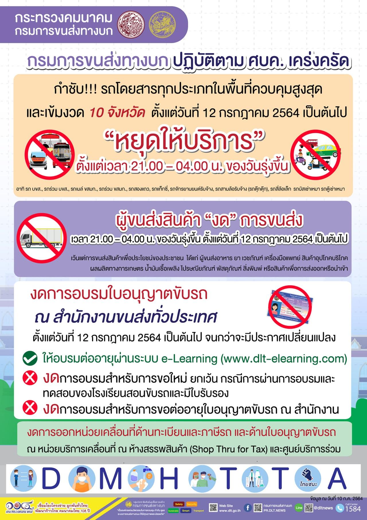 กรมการขนส่งทางบก กำชับรถโดยสารทุกประเภทในพื้นที่ควบคุมสูงสุดและเข้มงวด 10 จังหวัด หยุดให้บริการตั้งแต่ 3 ทุ่ม - ตี 4 ของวันรุ่งขึ้น พร้อมงดอบรมใบขับขี่ ตั้งแต่ 12 ก.ค.64