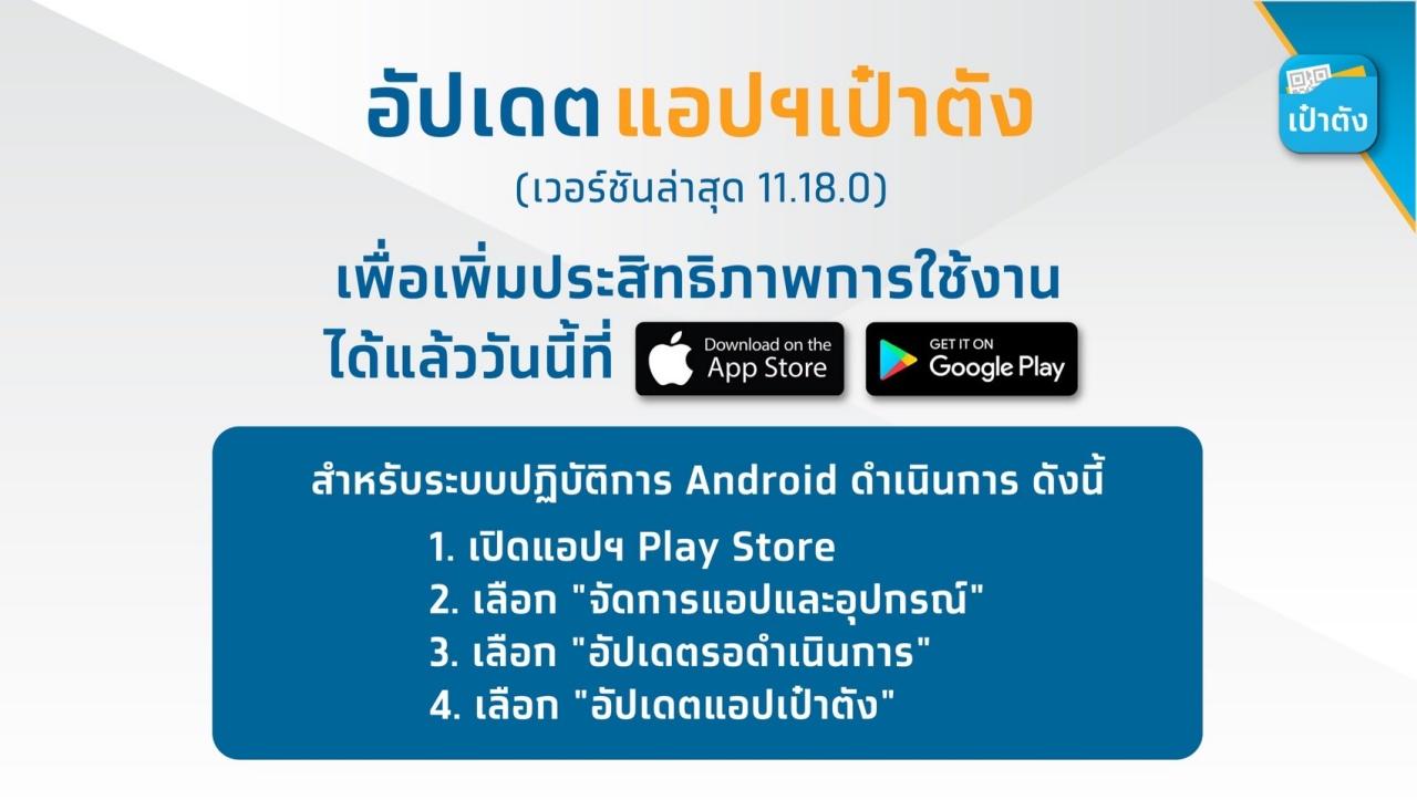 "ธนาคารกรุงไทย" ชี้แจงแอปพลิเคชัน "เป๋าตัง" สามารถใช้งานได้ตามปกติ พร้อมแนะขั้นตอนอัปเดตเวอร์ชันล่าสุด สำหรับผู้ใช้งานระบบ Android ที่พบปัญหาเข้าใช้งานไม่ได้