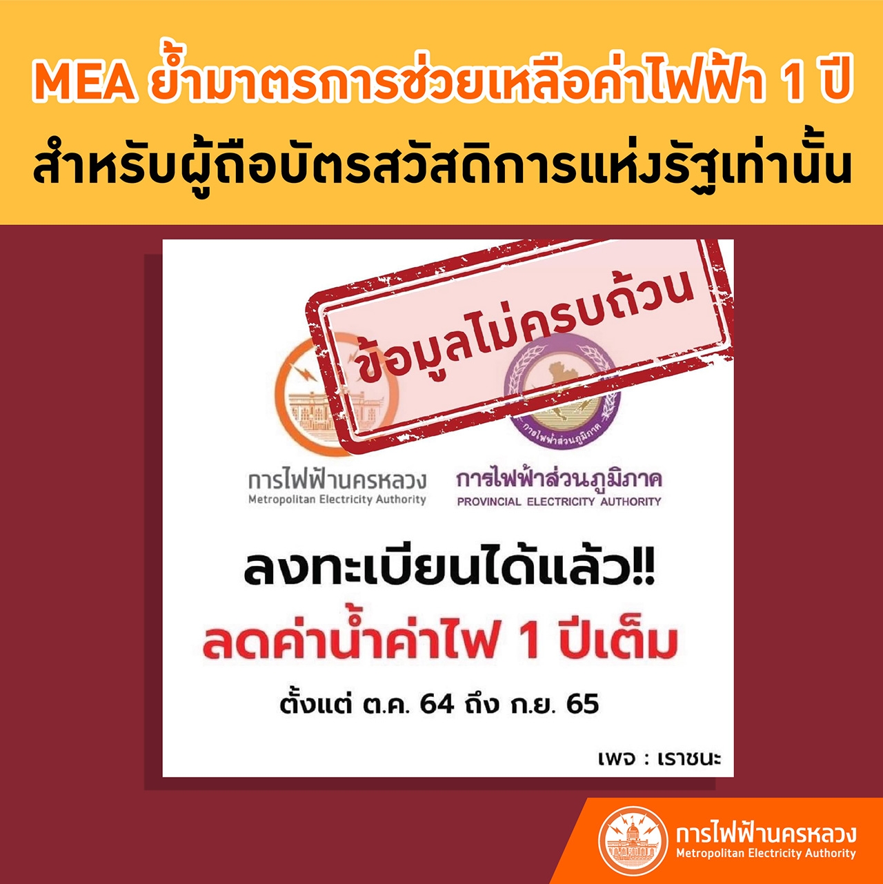 จากกรณีการเผยแพร่ข้อความในสื่อสังคมออนไลน์เกี่ยวกับมาตรการให้ส่วนลดค่าไฟฟ้าเป็นระยะเวลา 1 ปี โดยผู้ที่ลงทะเบียนแล้วจะได้รับสิทธิ์นั้น นายจุมภฎ หิมะเจริญ ผู้อำนวยการฝ่ายสื่อสารองค์กร MEA หรือ การไฟฟ้านครหลวง ชี้แจงว่า ในปัจจุบัน MEA มีมาตรการช่วยเหลือค่าไฟฟ้าเป็นระยะเวลา 1 ปีจริง แต่เป็นมาตรการสำหรับผู้ถือบัตรสวัสดิการแห่งรัฐเท่านั้น ซึ่งมาตรการดังกล่าวเป็นมาตรการเพิ่มเติมจากนโยบายสำหรับผู้ถือบัตรสวัสดิการแห่งรัฐเดิมที่เริ่มมีมาตรการมาตั้งแต่ปี 2561 จนถึงปัจจุบัน โดยล่าสุด ตามมติ ครม. เมื่อวันที่ 21 กันยายน 2564 ได้ขยายระยะเวลาเพิ่มเติมอีก 1 ปี คือ ช่วยเหลือค่าไฟฟ้าประจำเดือนตุลาคม 2564 ถึงกันยายน 2565 นอกจากนี้ ยังมีการเพิ่มจำนวนเงินช่วยเหลือค่าไฟฟ้าจากเดิมรายละ 230 บาทต่อเดือน เป็น 315 บาทต่อเดือน โดยผู้มีสิทธิ์รับเงินช่วยเหลือยังต้องชำระค่าไฟฟ้าปกติ