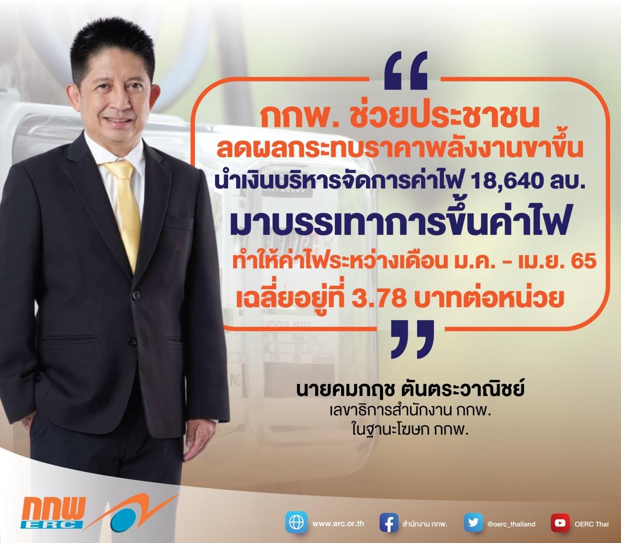 เมื่อวันที่ 19 พ.ย. 64 นายคมกฤช ตันตระวาณิชย์ เลขาธิการสำนักงานคณะกรรมการกำกับกิจการพลังงาน ในฐานะโฆษกคณะกรรมการกำกับกิจการพลังงาน หรือ กกพ. กล่าวว่า เมื่อวันที่ 17 พ.ย. 64 กกพ.มีมติให้ปรับค่าไฟฟ้าผันแปร หรือ ค่า FT สำหรับการเรียกเก็บค่าไฟฟ้าในรอบเดือนม.ค. – เม.ย.65 โดยให้เรียกเก็บที่ 1.39 สตางค์ต่อหน่วย ส่งผลให้อัตราค่าไฟฟ้าเฉลี่ยอยู่ที่ 3.78 บาทต่อหน่วย หรือเพิ่มขึ้น 4.63% จากงวดปัจจุบัน